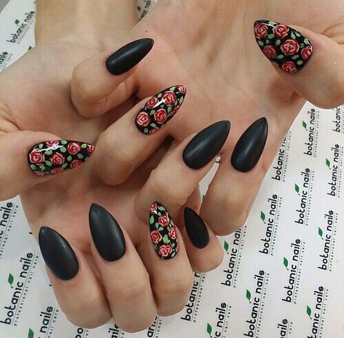 La manucure noire est au sommet de la popularité aujourd'hui, bien que la plupart des femmes la considèrent comme une option quotidienne provocante et inappropriée. Le design des ongles noirs donne à la femme de l'austérité, de la grâce et de la sexualité. Une manucure noire avec une peinture exquise confère aux mains féminines un aspect soigné et magnifique. Une impression florale sur fond noir est incroyablement séduisante. Quoi qu'il en soit, l'ornement floral est l'ornement le plus en vogue de 2026, vous ne devez donc pas éviter les motifs floraux étranges sur un revêtement noir d'ongles.