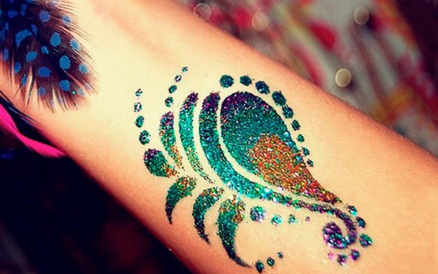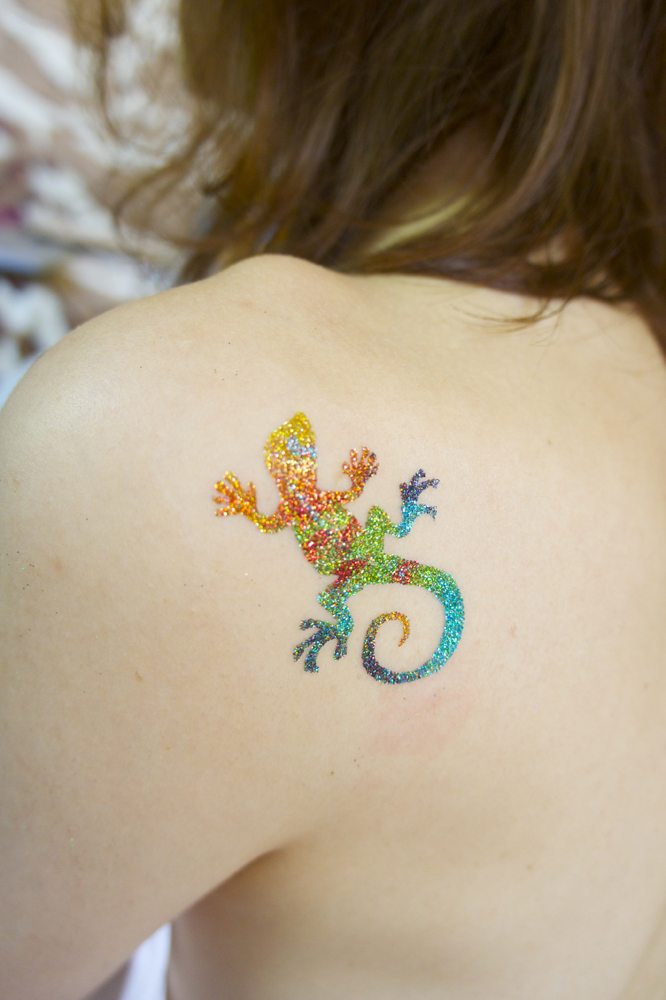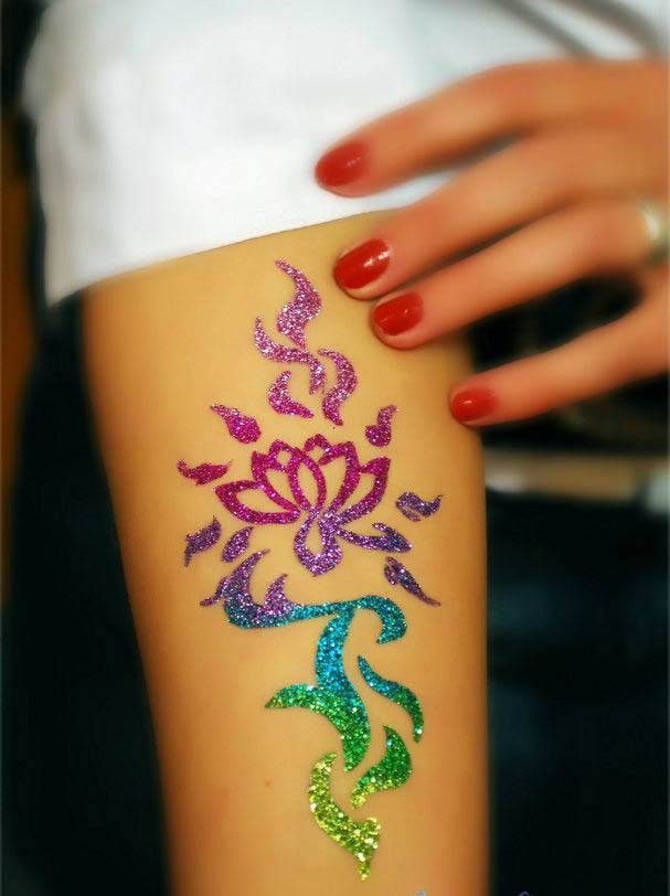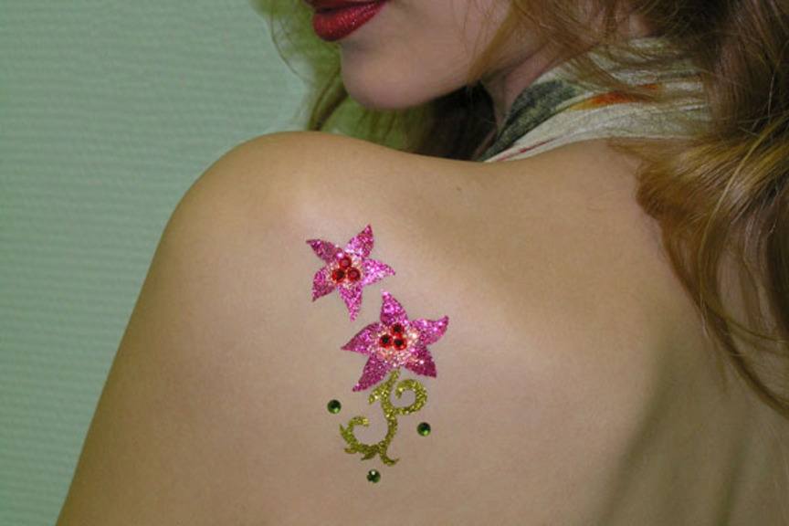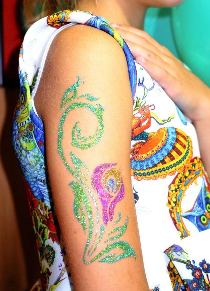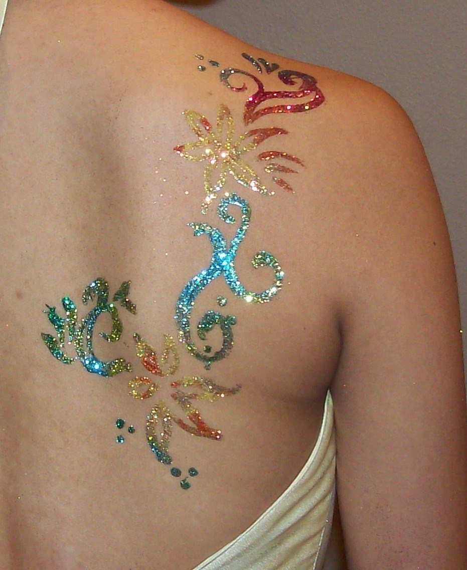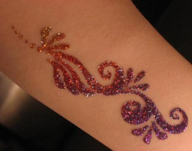 Un tatouage temporaire, réalisé à l'aide de paillettes attrayantes, est caractéristique pour attirer non seulement les filles, mais également les enfants de tout âge. Le motif est superbe et très visible même la nuit. Peu importe où le client souhaite appliquer le dessin, il choisit le plus souvent des parties du corps telles que les bras, les jambes, le dos ou la poitrine. Les enfants aiment surtout dessiner sur leurs visages des papillons ou des motifs floraux. Le tatouage de paillettes est considéré comme une solution universelle qui n’a aucun effet secondaire ni effet négatif sur la peau. Cette variété de dessins portables n'a pas non plus de restrictions de couleur ni de taille, tout dépend des désirs et des goûts du propriétaire. Une qualité tout aussi importante et positive d’un tel tatouage est l’utilisation d’une colle spéciale, totalement inoffensive pour la santé humaine, qui ne provoque ni irritation ni allergie.