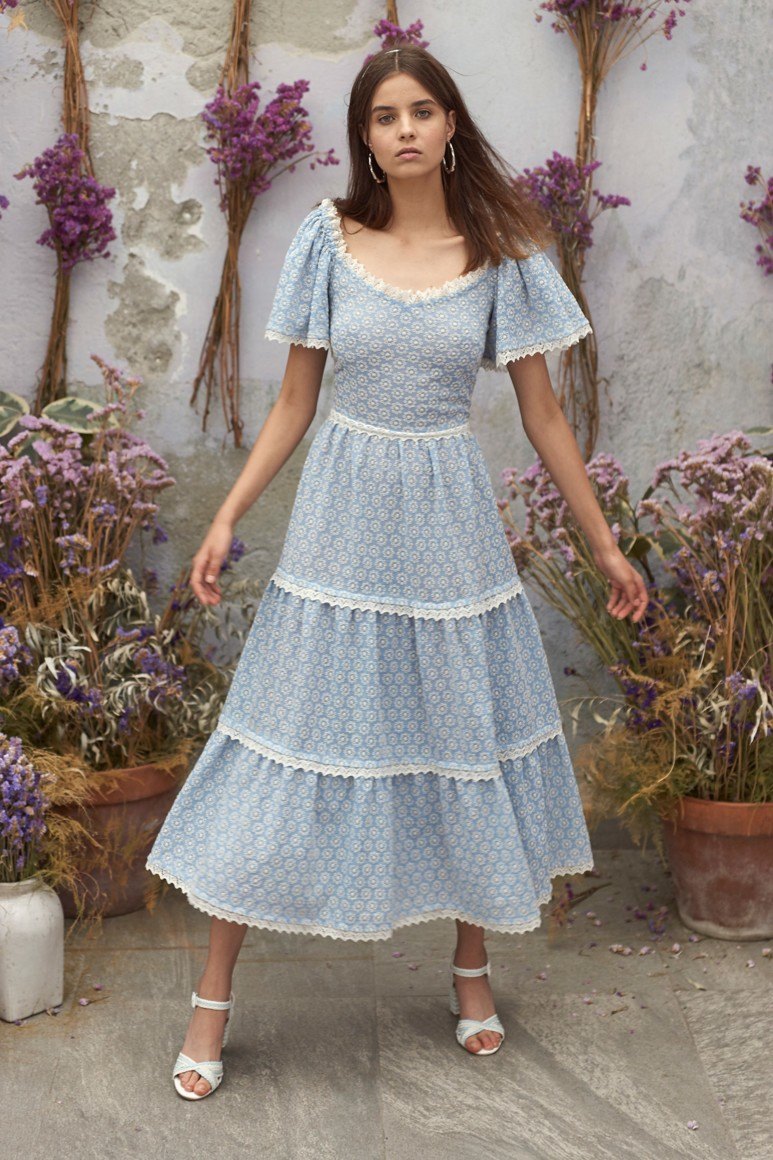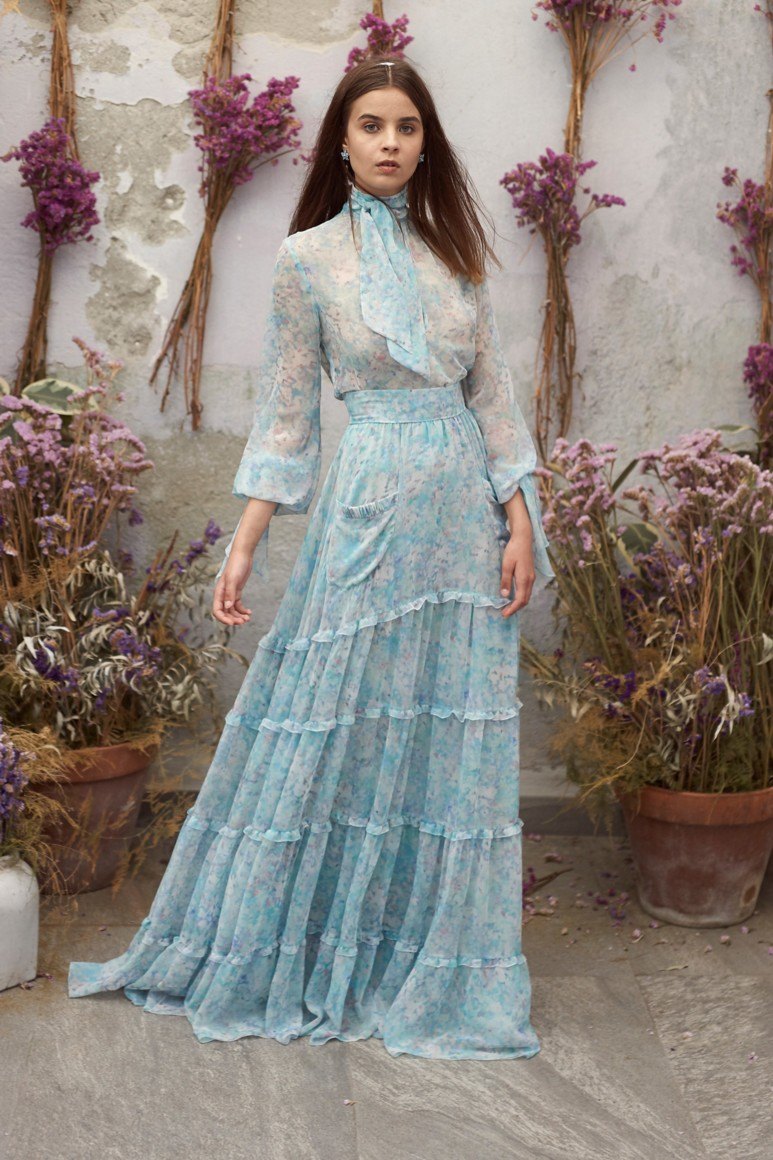 Des robes bleues au look raffiné et unique décorées avec des imprimés floraux. Les ornements floraux dans les versions modernes d'une robe bleue sont assez originaux. Parmi eux, il n'y a pas de motifs familiers, la petite fleur d'une grand-mère. Les créateurs ont proposé quelque chose d'incroyablement étonnant et les modèles les plus romantiques de robes bleues à imprimé floral sont présentés sur la photo ci-dessous.