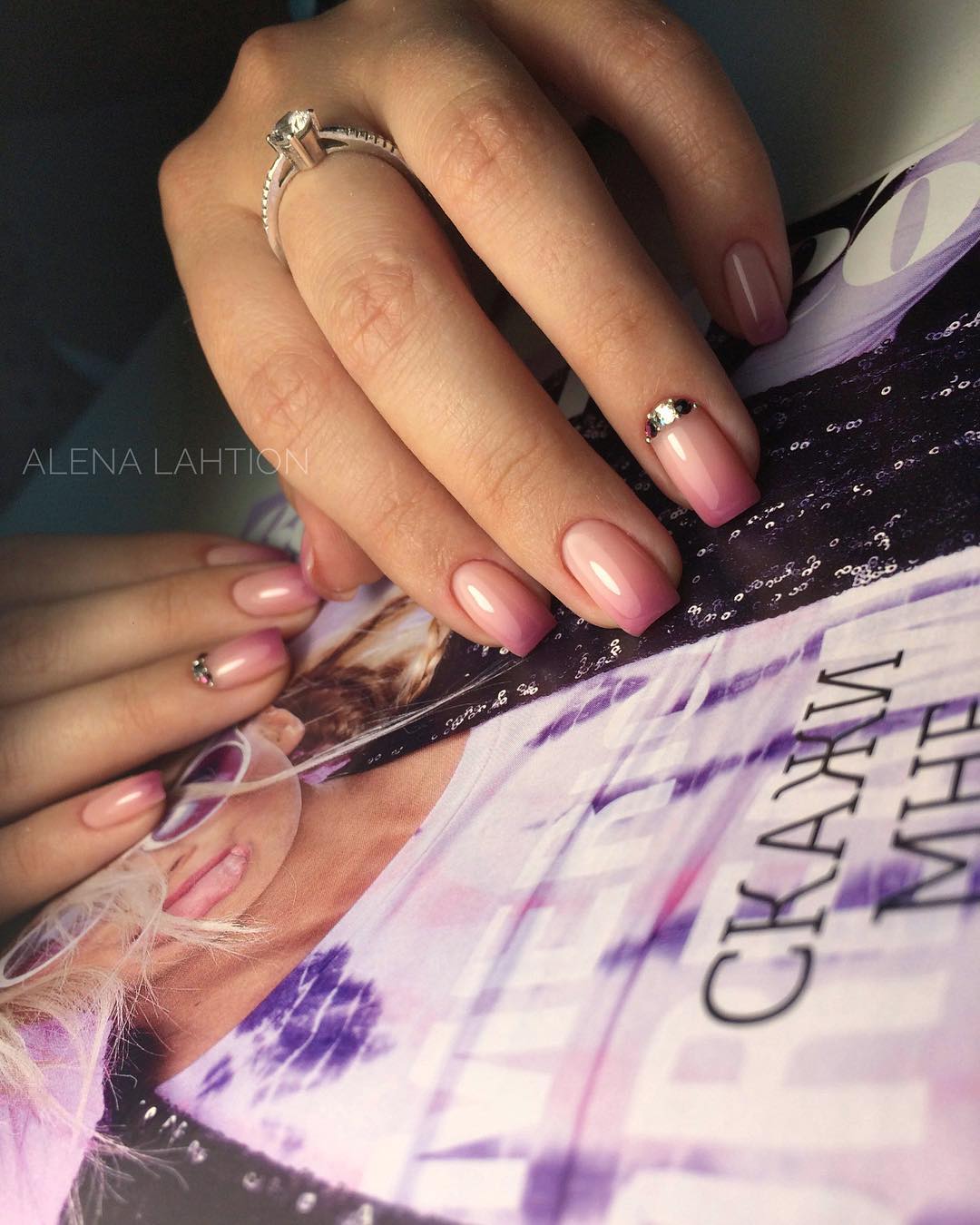 Pour ceux qui aiment le classique, nous suggérons d'ajouter un peu de variété à la conception. Pour ce faire, vous devez choisir une base de couleur neutre. À son tour, la ligne du sourire ou le trou ne doit pas être clairement tracé, mais flou. Une telle conception est impressionnante et ne vous laissera certainement pas sans compliments.