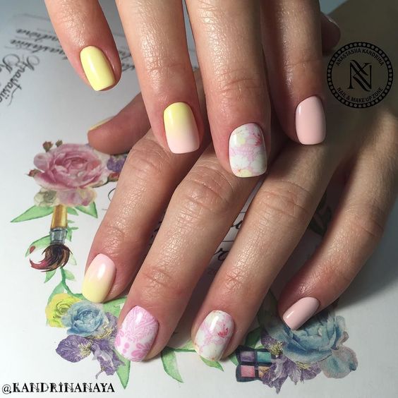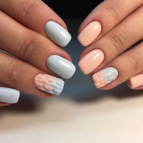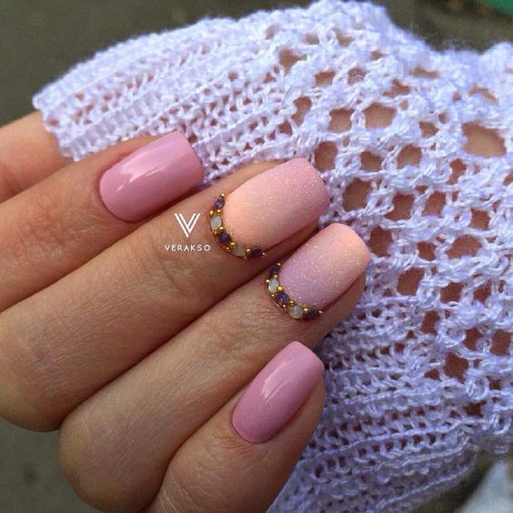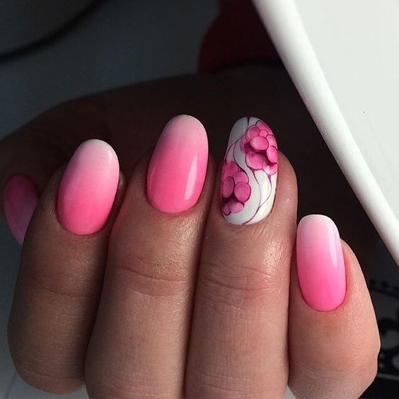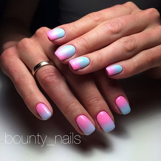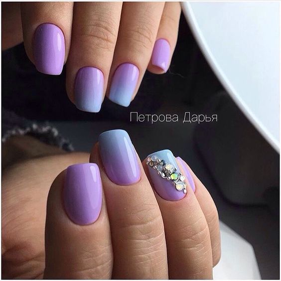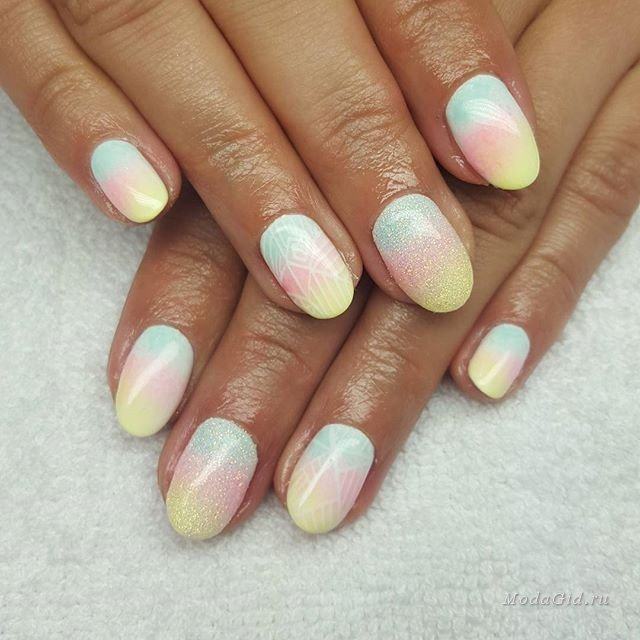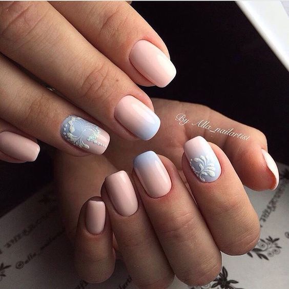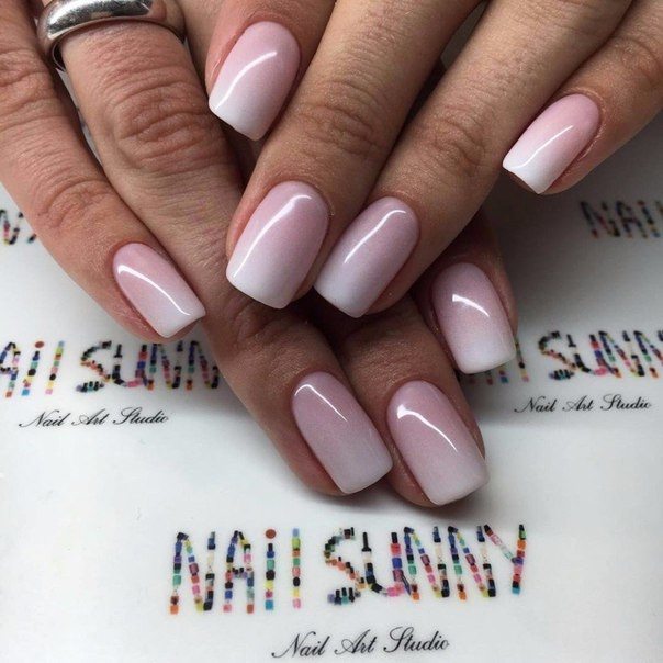 En outre, un dégradé horizontal peut être utilisé comme accent. Autrement dit, tous les ongles, sauf un ou deux, doivent avoir un revêtement uniforme. Le plus approprié dans ce cas sera les couleurs pastel. Cependant, d'autres options sont possibles.