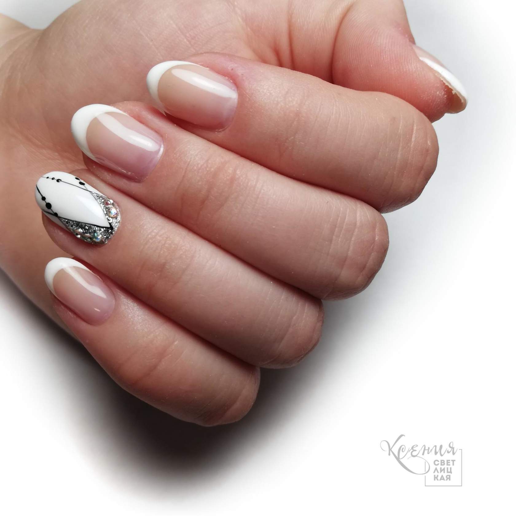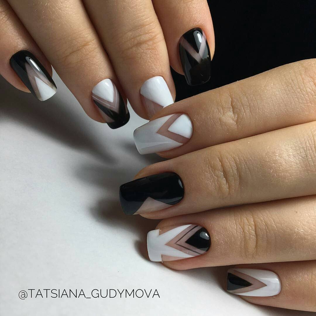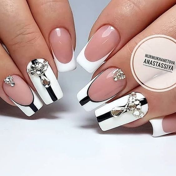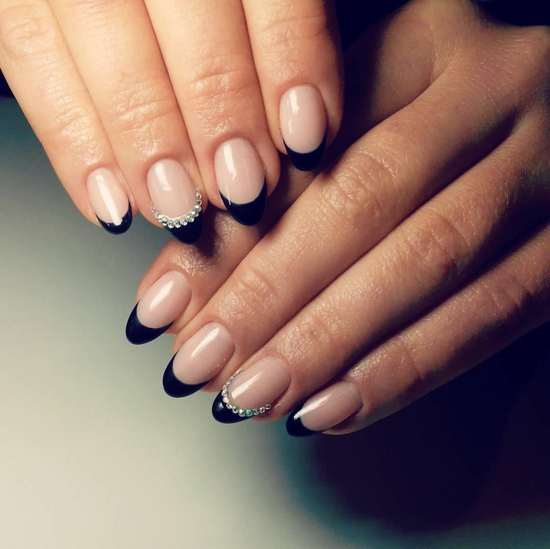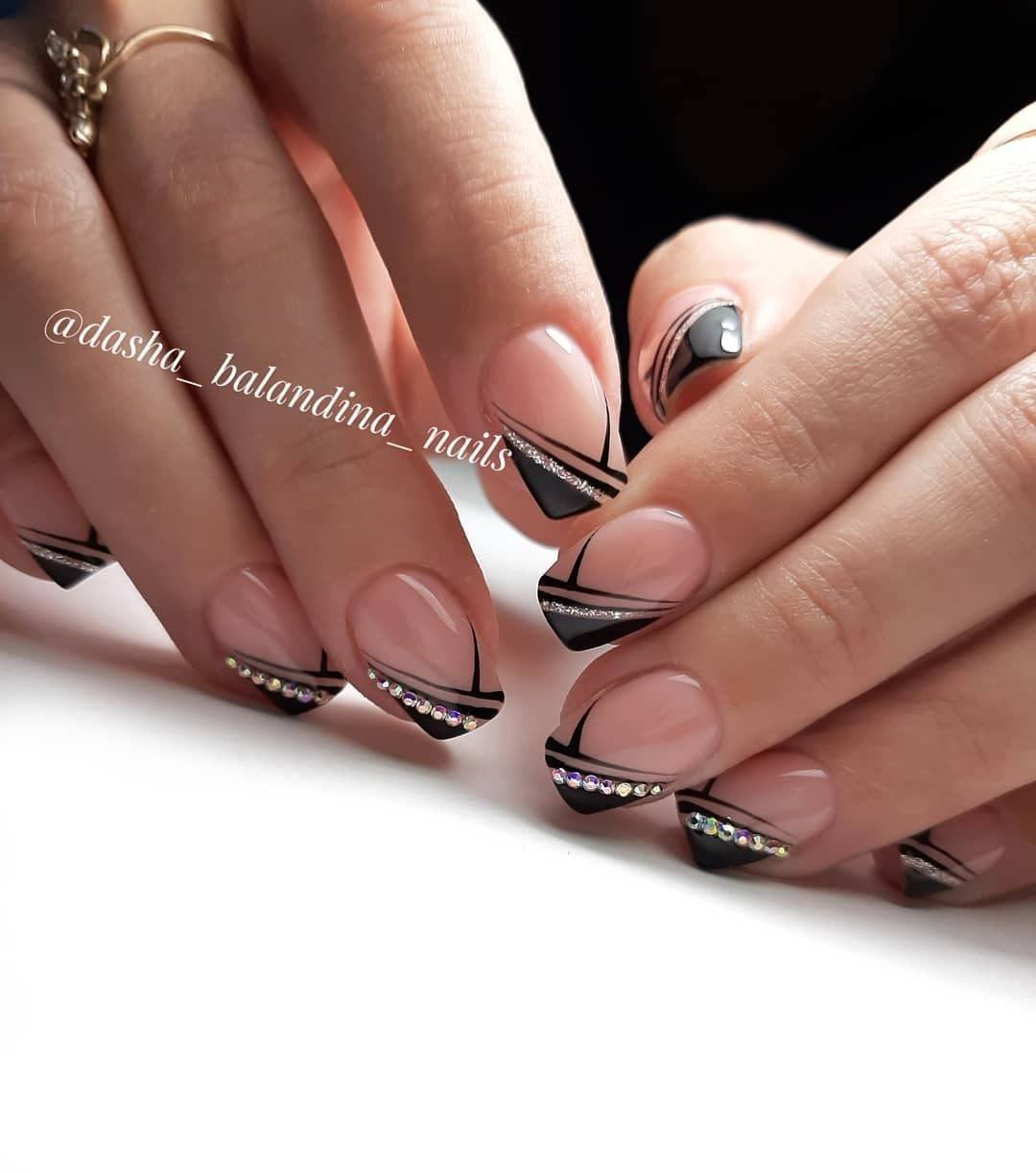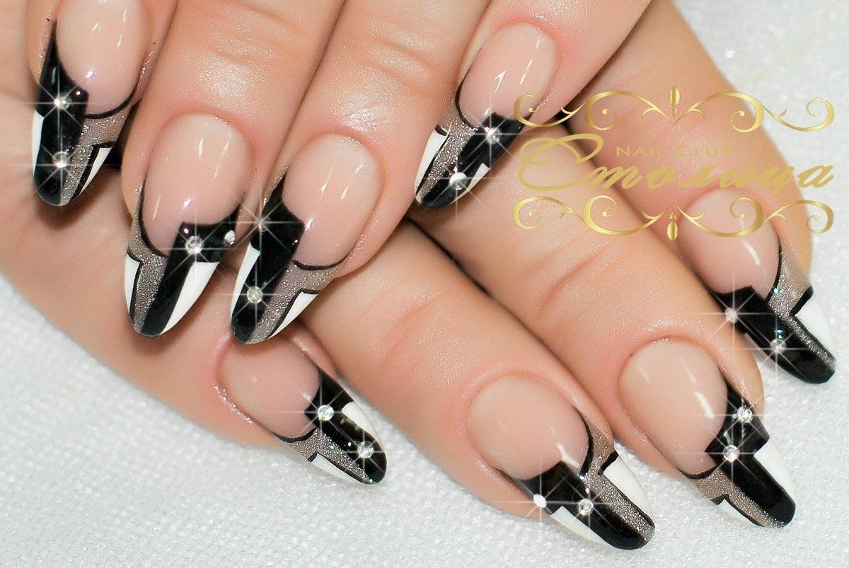 La brillance et l’étincelle des strass ajouteront une originalité et des nuances de luxe à toutes les versions de manucure. Le français en noir et blanc ne fait pas exception. Les placers de pierres brillantes attirent l'attention sur vos ongles! Essayez d’utiliser des strass noirs dans votre manucure et ils vous émerveilleront avec leur éclat magique et envoûtant. Décorez la base de l'ongle ou la ligne d'un sourire et vous serez satisfait du résultat. Fabriquez une veste de manière géométrique et décorez les contours du revêtement avec des strass de couleurs opposées. Tout simplement génial!