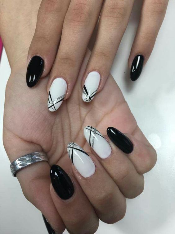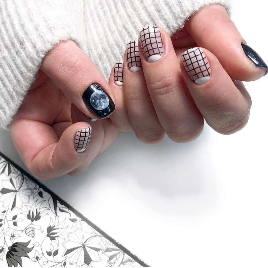 Si vous souhaitez diversifier votre manucure en noir et blanc, essayez d'appliquer un revêtement noir et mettez en surbrillance la ligne du sourire en blanc. Est-ce une solution inhabituelle? Magnifiquement, cette technique d'application se penchera sur plusieurs clous et de manière très originale dans la technique de la géométrie complexe. Soulignez le sourire avec des doubles lignes blanches, ajoutez des cailloux mousseux et le tour est joué - le design unique est prêt! Une autre option pour cette conception est la veste "déplacée". Nous soulignons la lune à la base avec une ligne blanche idéale, et le complément parfait au style ou à la coiffure rétro est prêt.