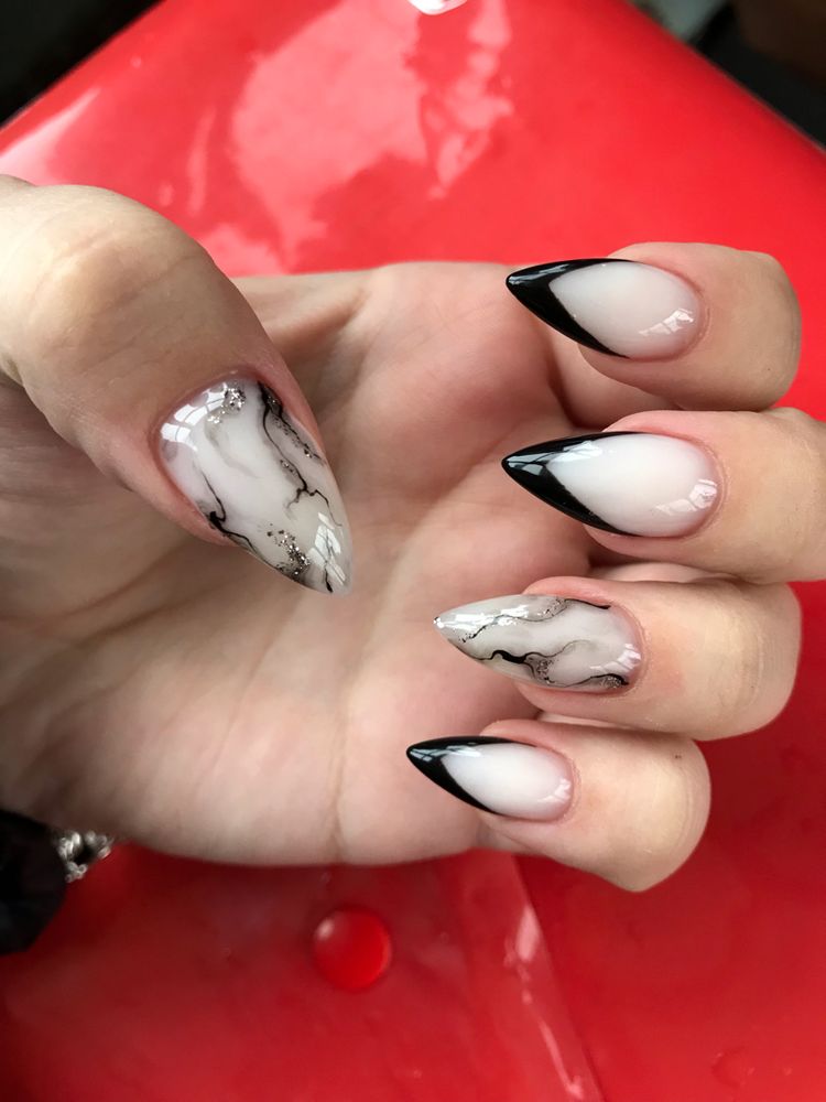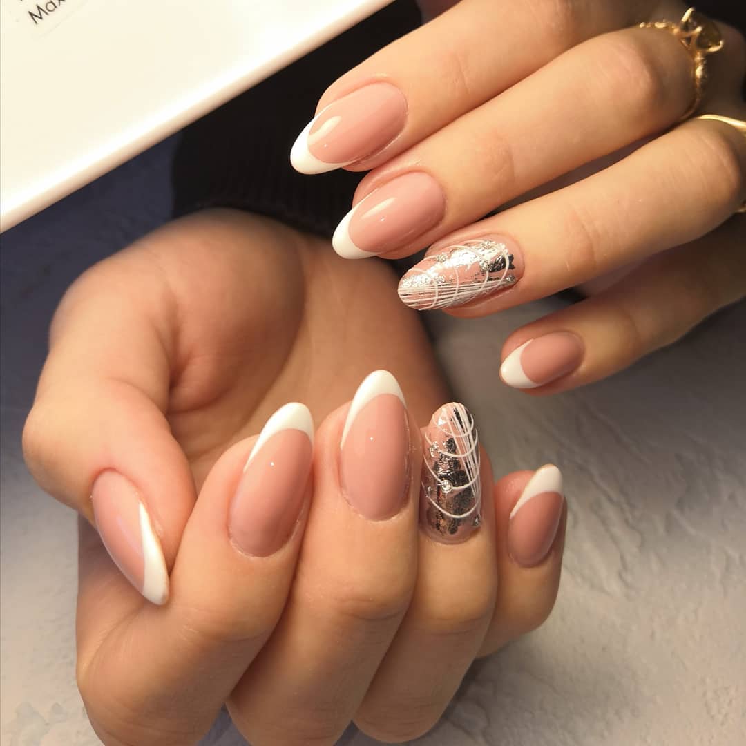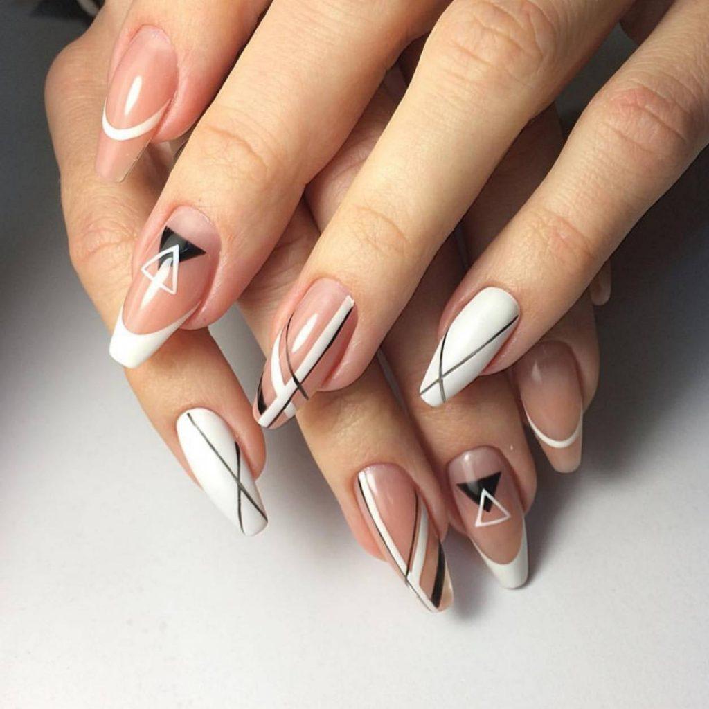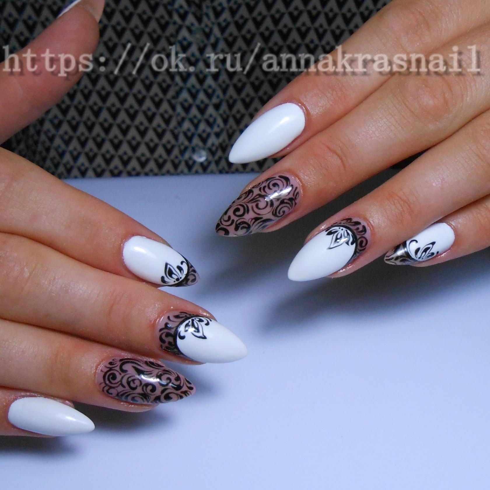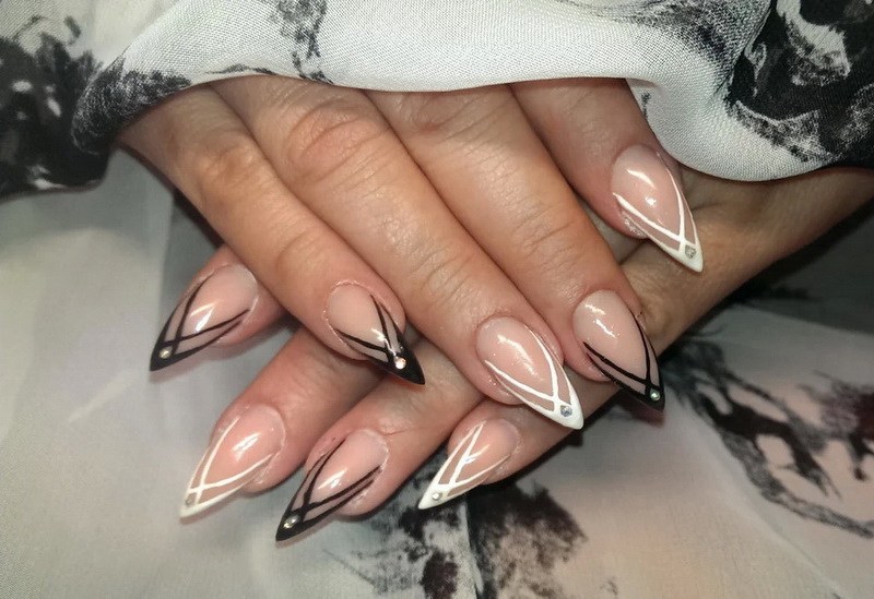 Toutes les femmes ne préfèrent pas la forme aiguë des ongles. Considéré comme peu pratique et peu pratique, il occupe tout de même une position de leader dans le monde de la mode. Les clous pointus ont leurs fans qui admirent leurs ongles et créent leur design inhabituel. Pour souligner et souligner cette forme, les maîtres de salon suggèrent d’utiliser une veste française noire et blanche. Ces soucis avec une bande blanche au-dessous du milieu de la plaque ont l’air très extravagant. En outre, de minces sourires blancs sur le bord ou un large sourire presque au milieu de l'ongle, en forme d'arc, sont considérés comme une excellente option. Les peintures ajourées, divers éléments décoratifs dans une application discrète, soulignent habilement le point culminant de votre manucure.