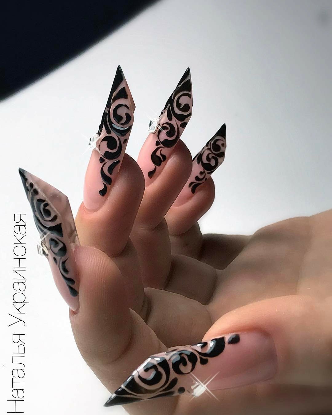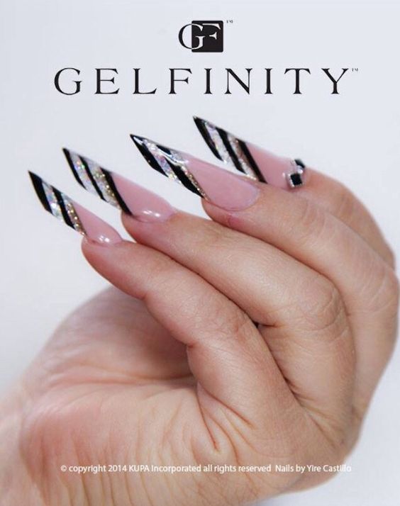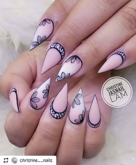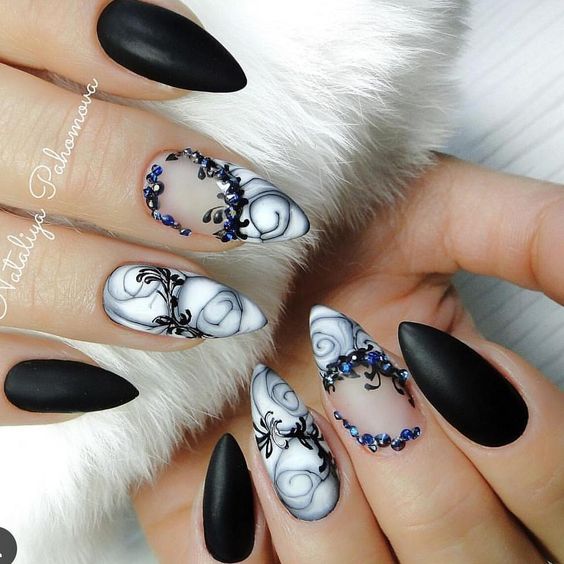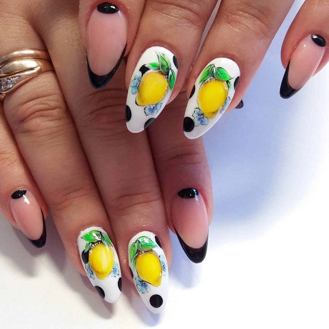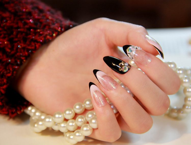 Toutes les femmes ne préfèrent pas la forme aiguë des ongles. Considéré comme peu pratique et peu pratique, il occupe tout de même une position de leader dans le monde de la mode. Les clous pointus ont leurs fans qui admirent leurs ongles et créent leur design inhabituel. Pour souligner et souligner cette forme, les maîtres de salon suggèrent d’utiliser une veste française noire et blanche. Ces soucis avec une bande blanche au-dessous du milieu de la plaque ont l’air très extravagant. En outre, de minces sourires blancs sur le bord ou un large sourire presque au milieu de l'ongle, en forme d'arc, sont considérés comme une excellente option. Les peintures ajourées, divers éléments décoratifs dans une application discrète, soulignent habilement le point culminant de votre manucure.