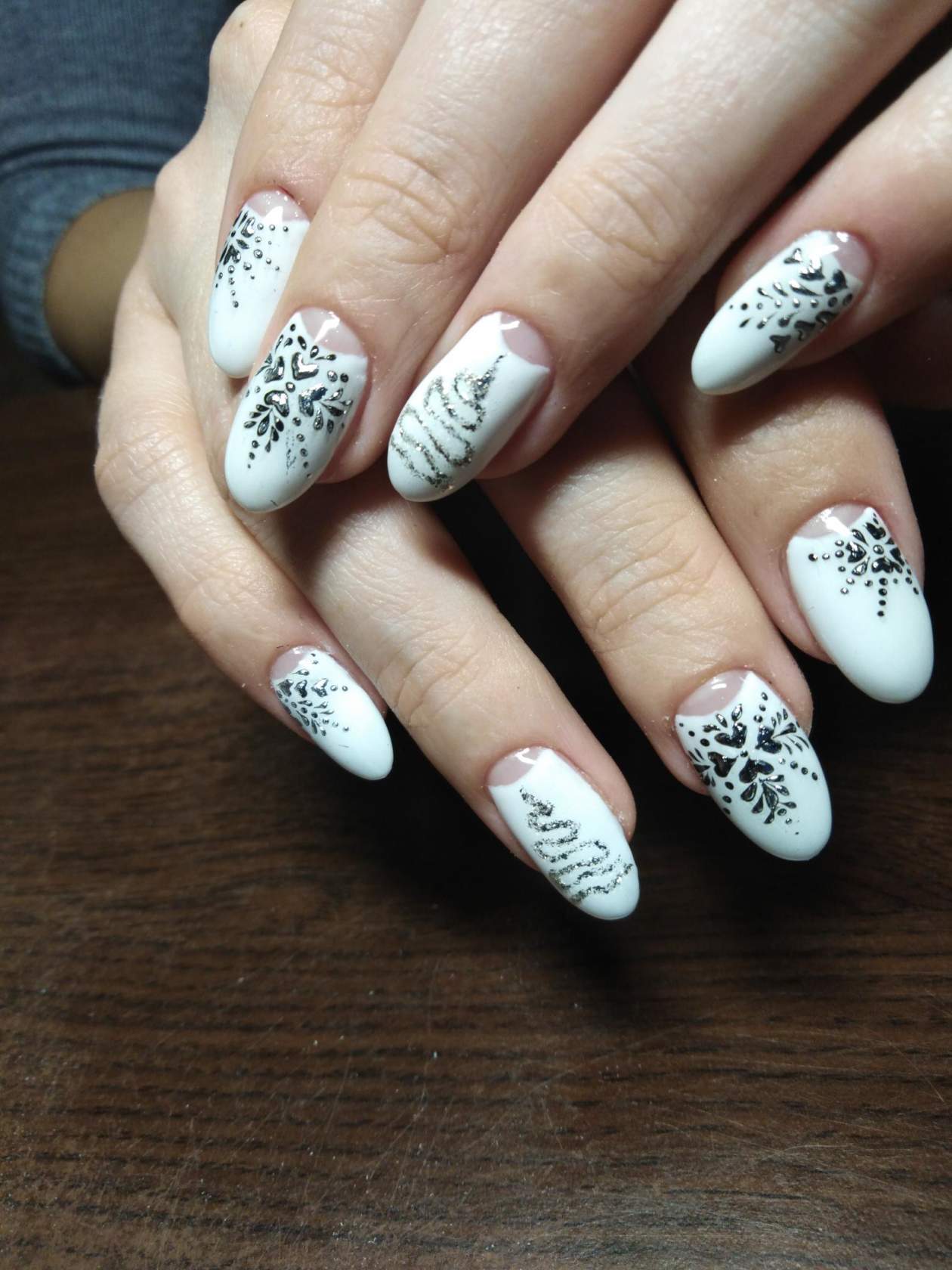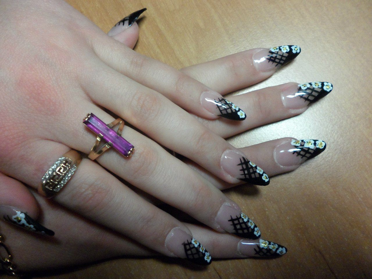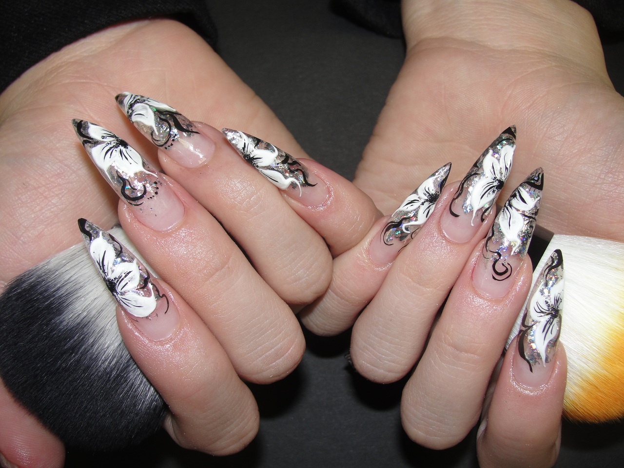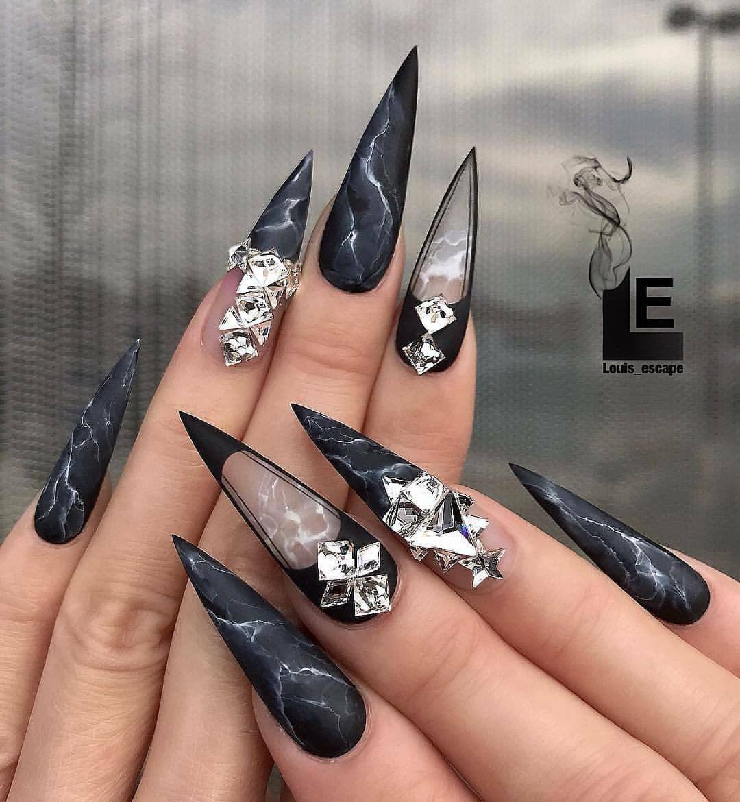 Toutes les femmes ne préfèrent pas la forme aiguë des ongles. Considéré comme peu pratique et peu pratique, il occupe tout de même une position de leader dans le monde de la mode. Les clous pointus ont leurs fans qui admirent leurs ongles et créent leur design inhabituel. Pour souligner et souligner cette forme, les maîtres de salon suggèrent d’utiliser une veste française noire et blanche. Ces soucis avec une bande blanche au-dessous du milieu de la plaque ont l’air très extravagant. En outre, de minces sourires blancs sur le bord ou un large sourire presque au milieu de l'ongle, en forme d'arc, sont considérés comme une excellente option. Les peintures ajourées, divers éléments décoratifs dans une application discrète, soulignent habilement le point culminant de votre manucure.