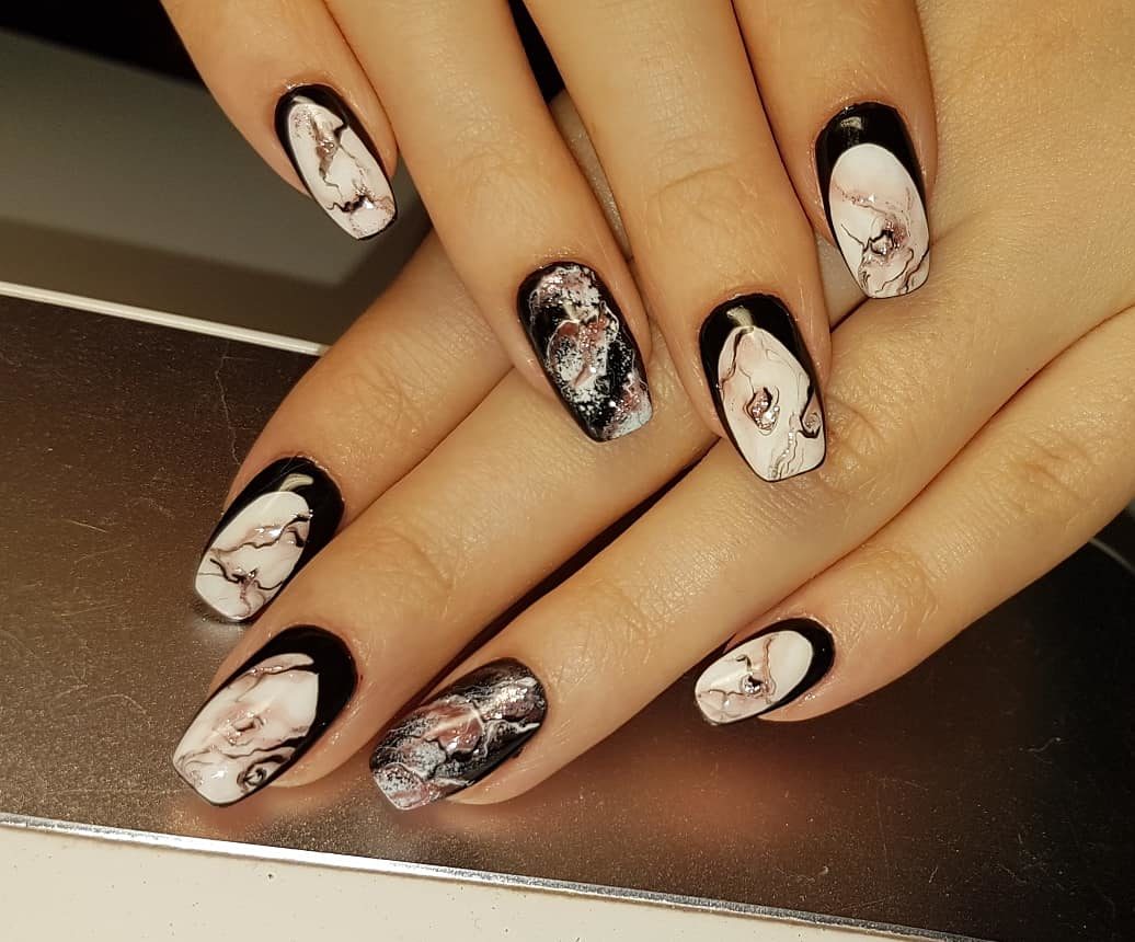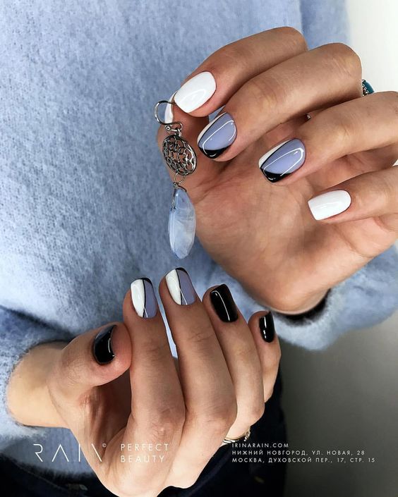 Veste noire et blanche sur les ongles carrés