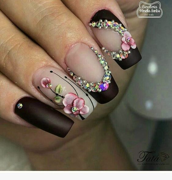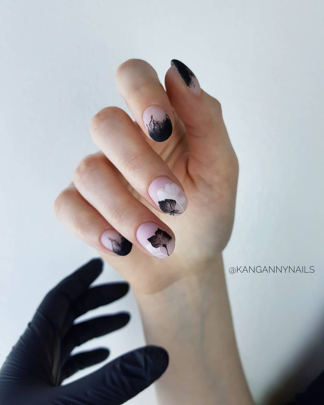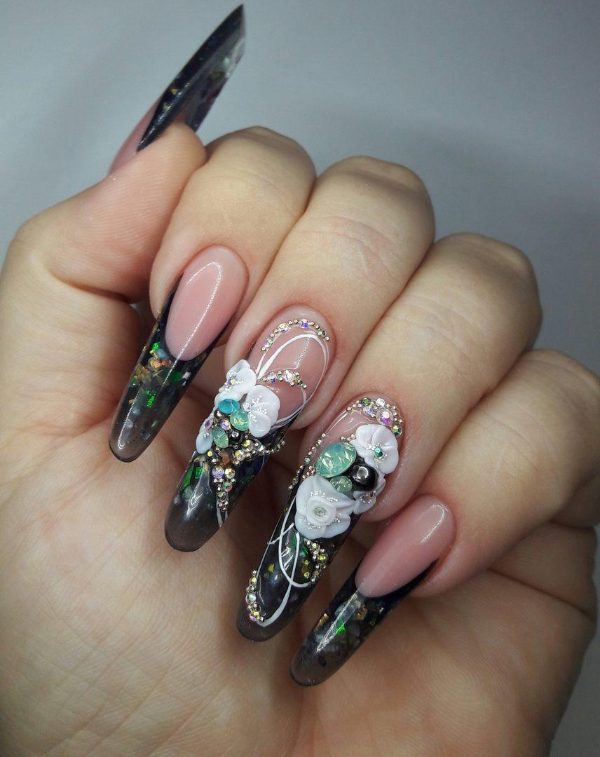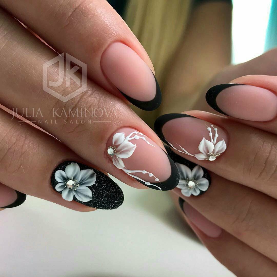 Les motifs floraux à l'image d'une femme soulignent toujours avec succès sa féminité. Pour donner une manucure stricte au romantisme et à la douceur, utilisez divers dessins sur des thèmes floraux. Appliquez des fleurs de différentes techniques et de différentes tailles. Les fleurs de couleurs vives conviennent parfaitement à une veste noire. Les fleurs seront spectaculaires dans le ton du revêtement choisi. Dans notre version, c'est noir et blanc. Vous pouvez appliquer des motifs floraux en tamponnant, en utilisant des autocollants ou des pochoirs.