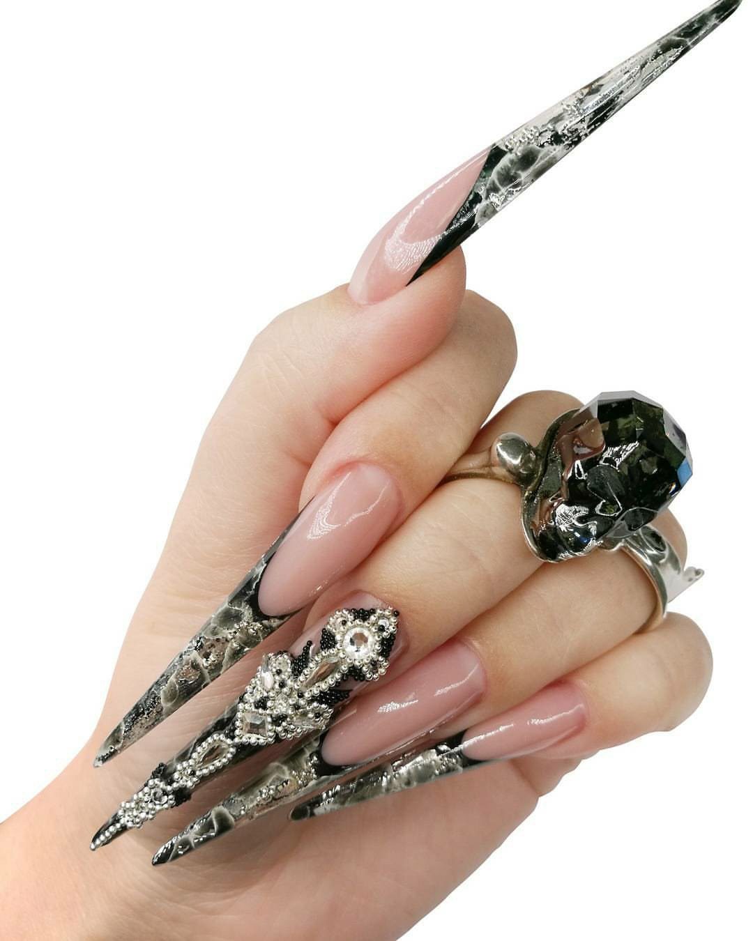Veste noire et blanche sur des ongles acérés