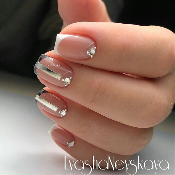 Certaines jeunes filles considèrent qu'il est nécessaire d'ajouter des notes irrésistibles et explosives à la version classique de la manucure. Les maîtres suggèrent d'utiliser des strass pour cette fantaisie. Les pierres scintillantes soigneusement disposées sur le bord du sourire apporteront une touche originale et dilueront votre quotidien. Une telle manucure est également pertinente pour un événement solennel.