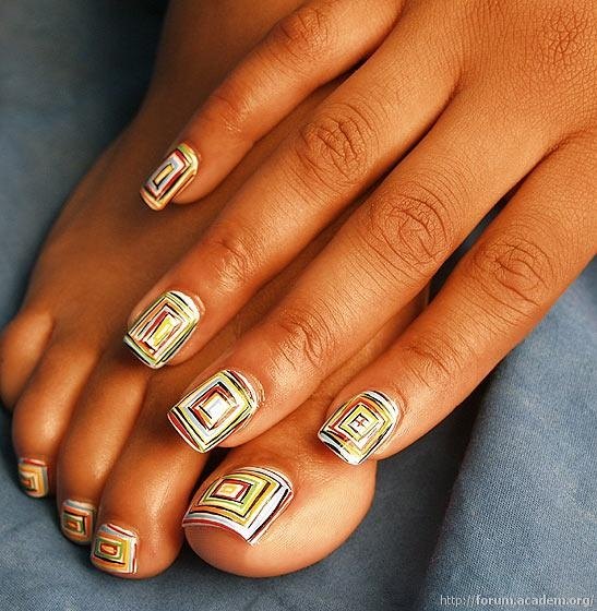 Les ornements remarquables de la céramique sicilienne vous permettent de créer une pédicure hautement artistique. Particulièrement spectaculaires, ces motifs brillants se combinent à un seul doigt et le reste au revêtement. L'essentiel est que le revêtement monochrome soit combiné au jeu de couleurs principal du motif sicilien. Un tel ornement met un accent supplémentaire sur les jambes.