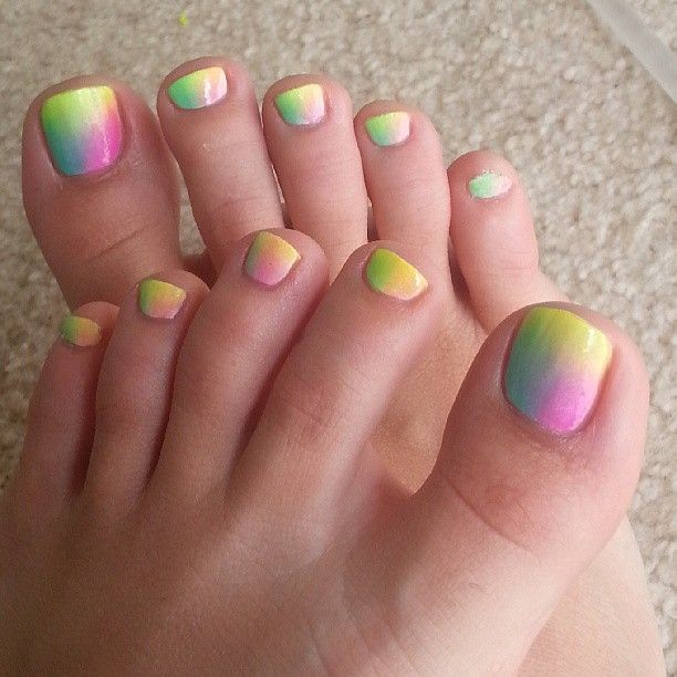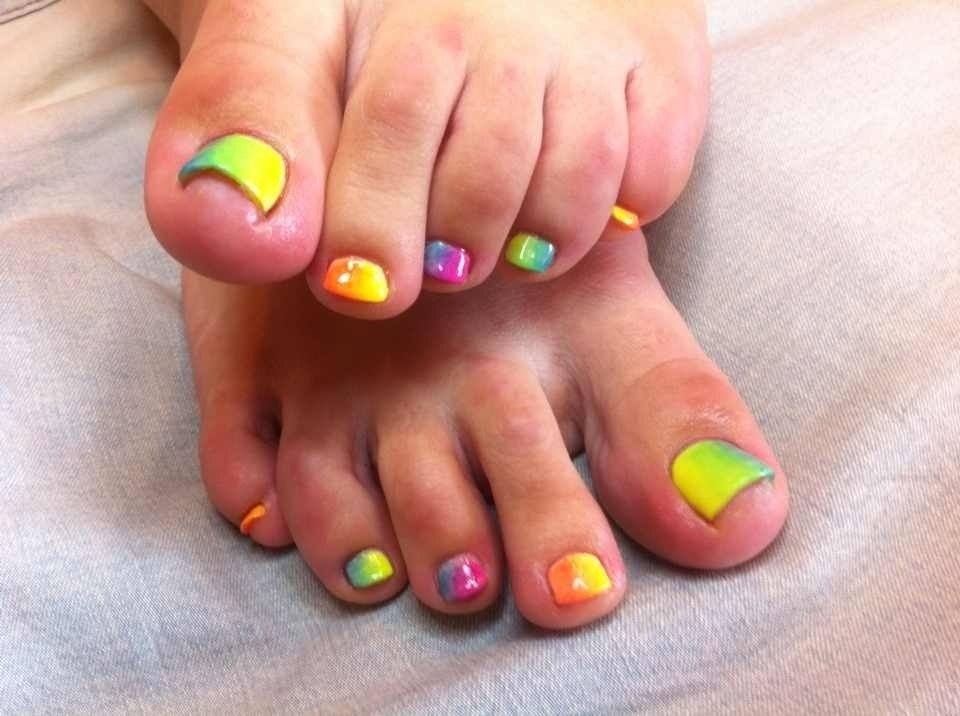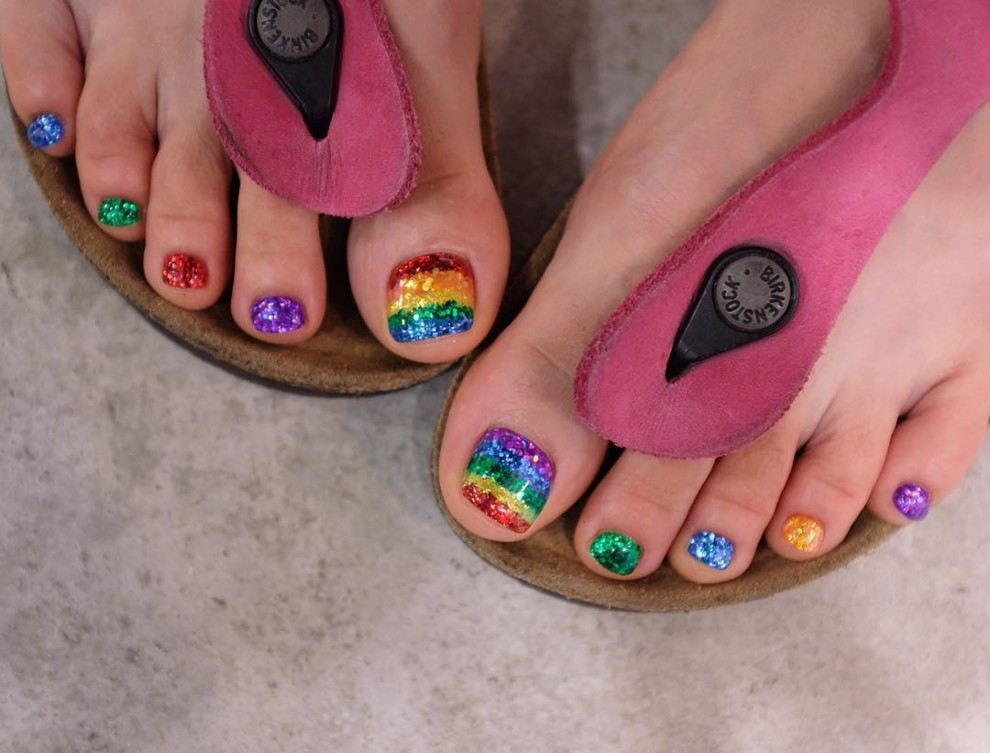 Pédicure Peerless - arc-en-ciel. Toutes les couleurs de l'arc-en-ciel sur les ongles donnent une sensation de joie. L'arc-en-ciel est particulièrement impressionnant sur un revêtement de paillettes.