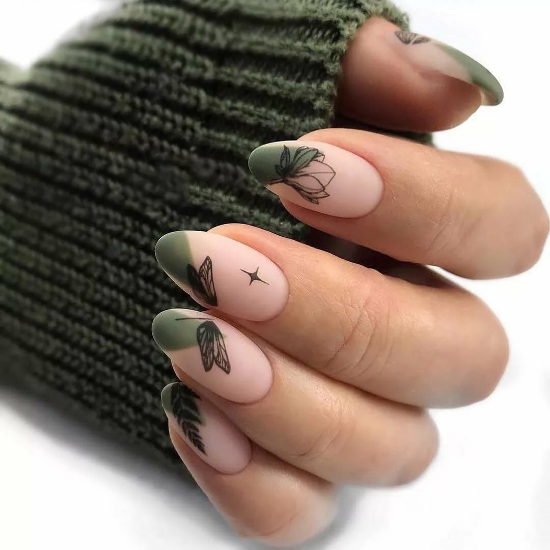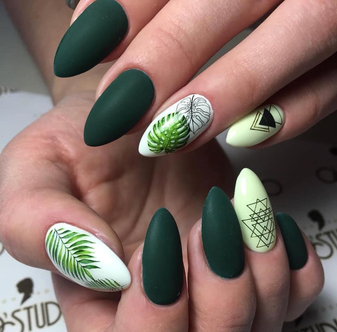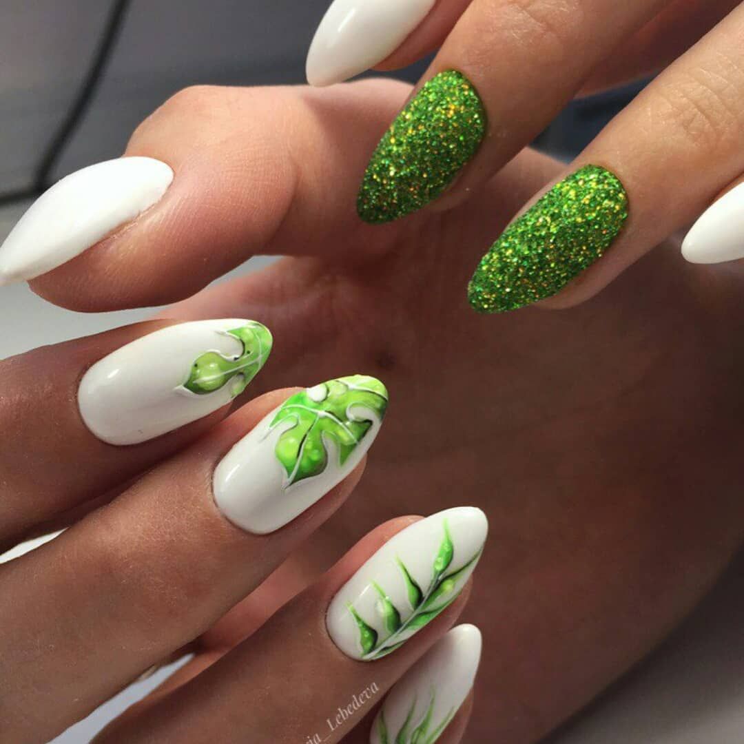 Les grandes feuilles vertes sont devenues un véritable succès de la saison estivale. Ils complètent parfaitement la manucure dans des tons neutres. De plus, le design est brillant, juteux et très intéressant.