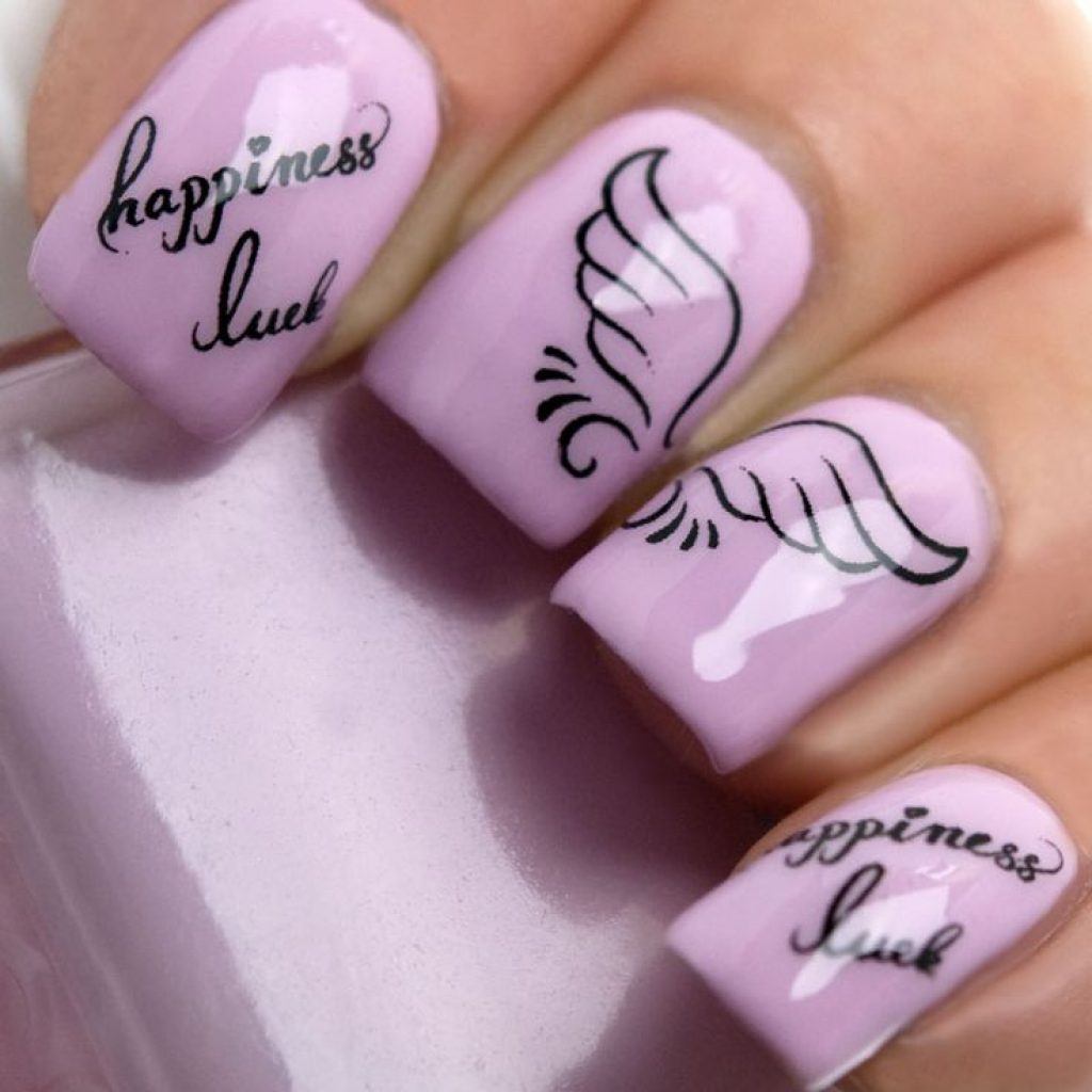 Le plus souvent sur les ongles, vous pouvez voir des phrases amusantes ou motivantes. Ils vous remontent le moral à tout moment et vous font avancer. Les phrases de fantaisie avec des modèles thématiques sont également populaires. Cependant, toutes les filles n'apprécieront pas cette option.