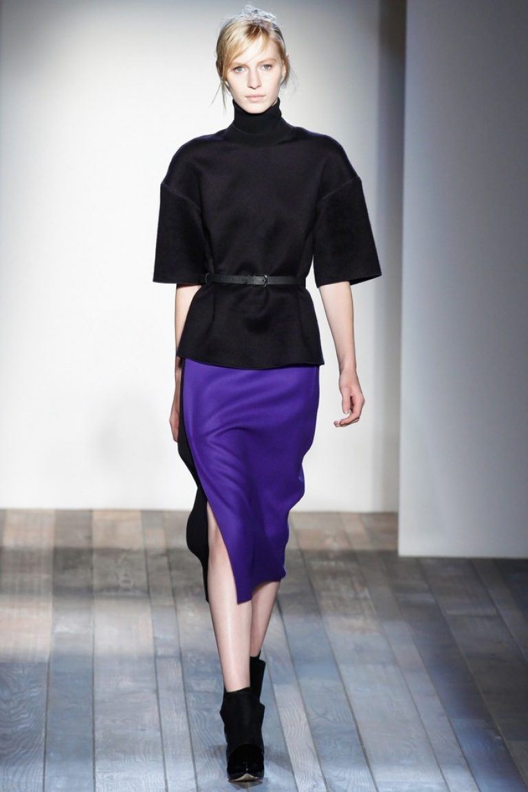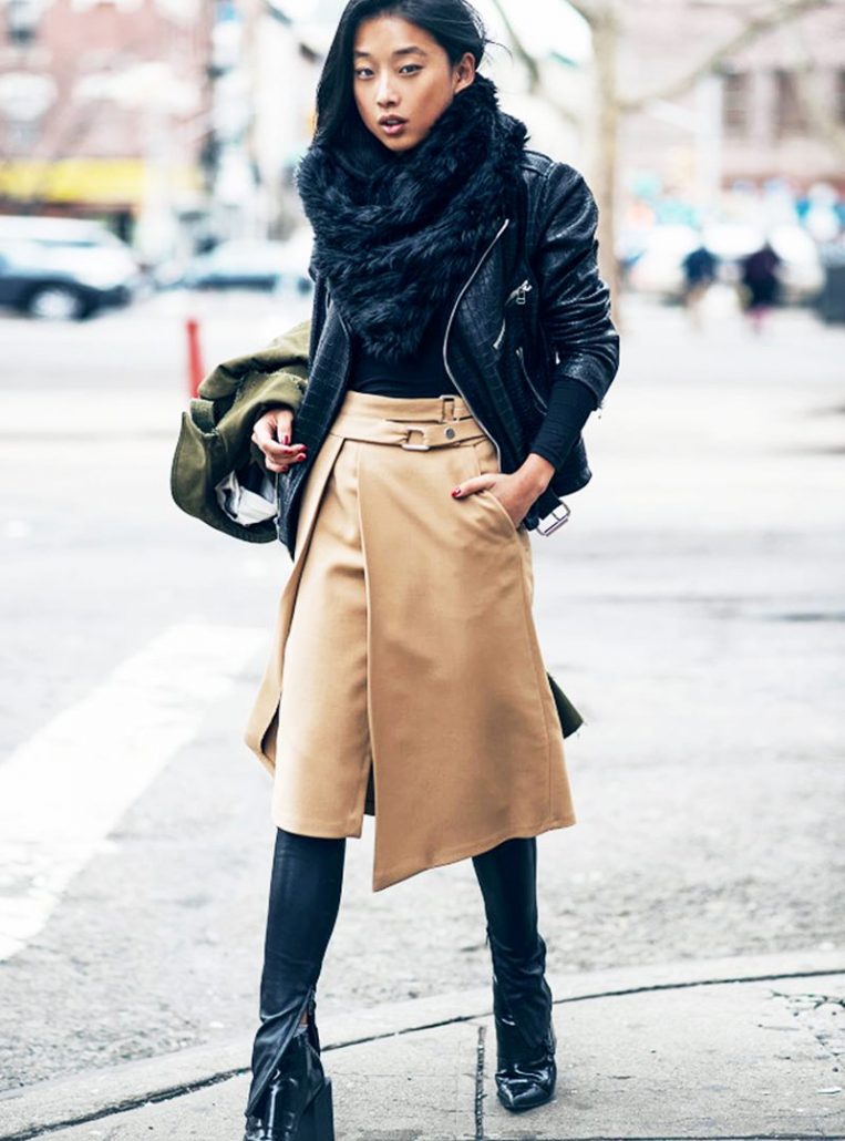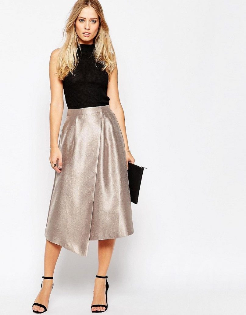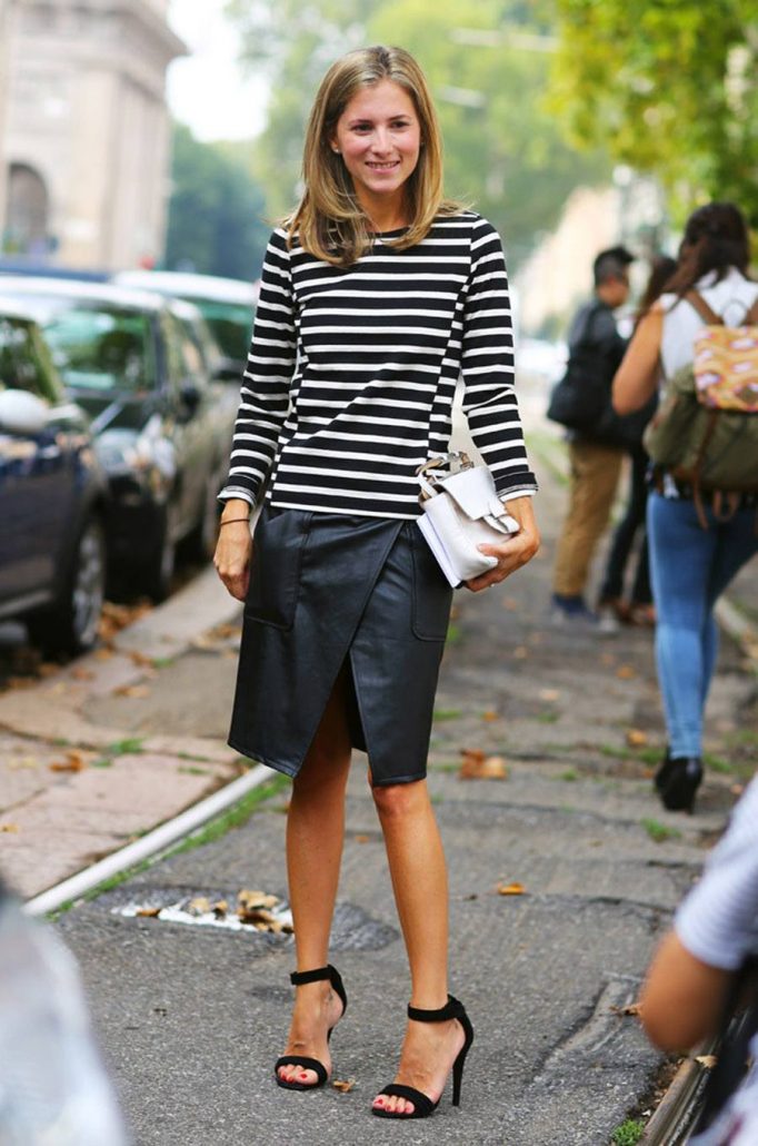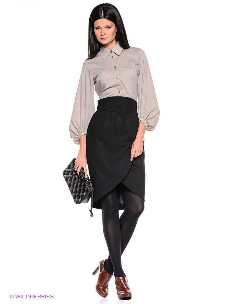 Pour que l'image soit harmonieuse, il est important de choisir les bonnes choses. Lorsque vous choisissez une jupe portefeuille sombre, l'accent doit être mis sur le haut contrasté. Des cols roulés, des hauts ou des pulls légers sont parfaits.