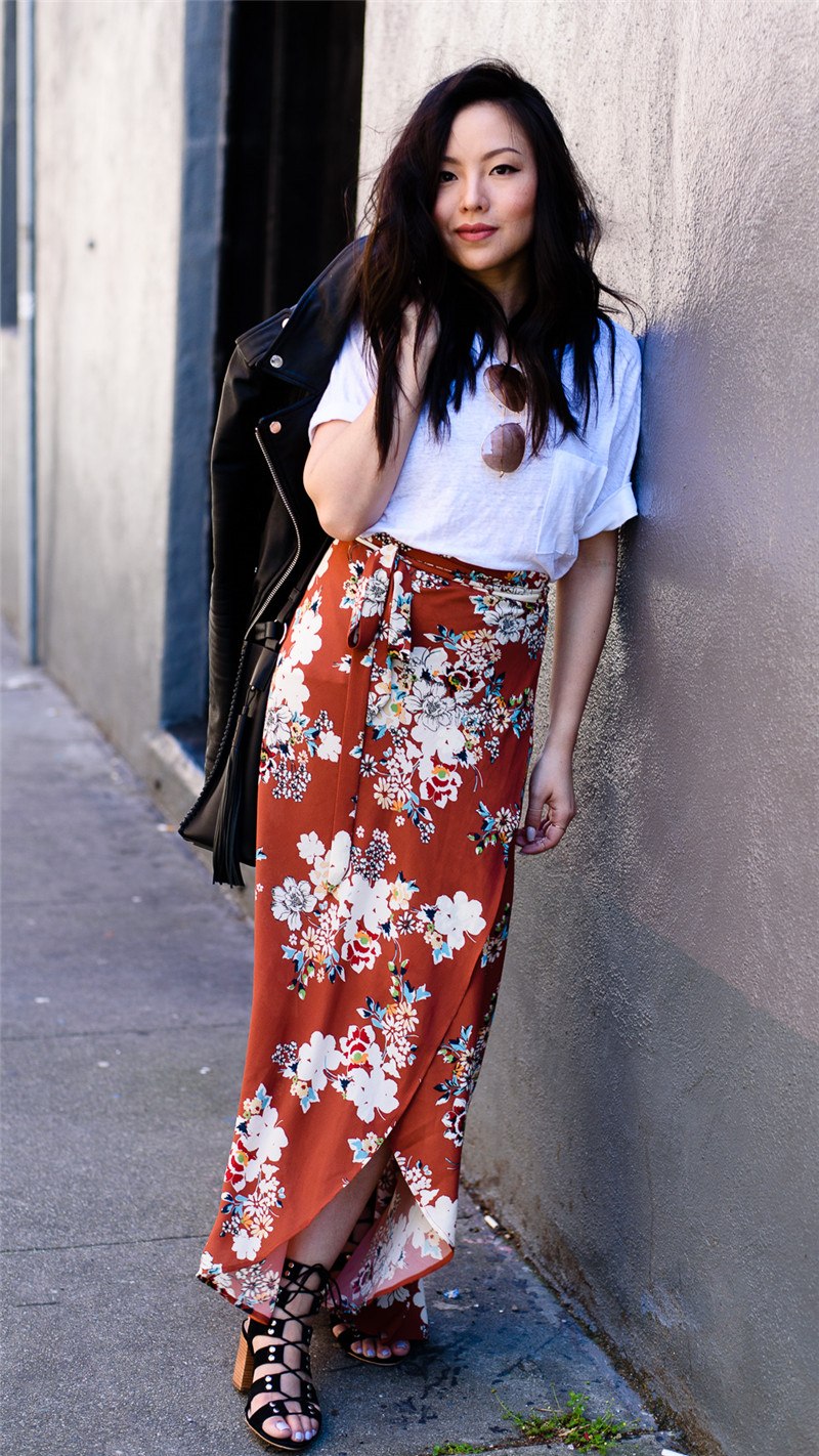Une jupe longue avec un t-shirt ou une tunique et des chaussures de sport seront un choix judicieux dans un style urbain.