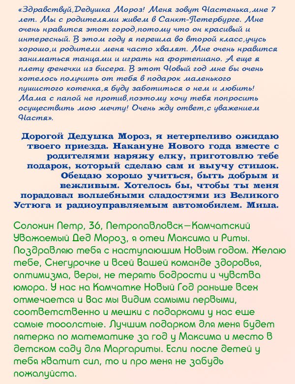 - Faites attention au bébé que si soudainement la réponse ne vient pas, alors vous ne devriez pas être contrarié. En effet, grand-père reçoit beaucoup de lettres d'enfants du monde entier. Par conséquent, il doit lire et écrire beaucoup de réponses. En même temps, le bébé doit se rappeler que les rêves, s’ils y croient sincèrement, se réaliseront.