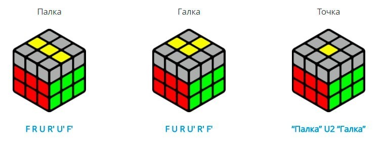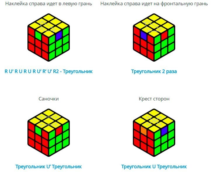 - Après cela, la couche supérieure est complètement collectée. Cette étape s'appellera OLL et consiste en de tels algorithmes.