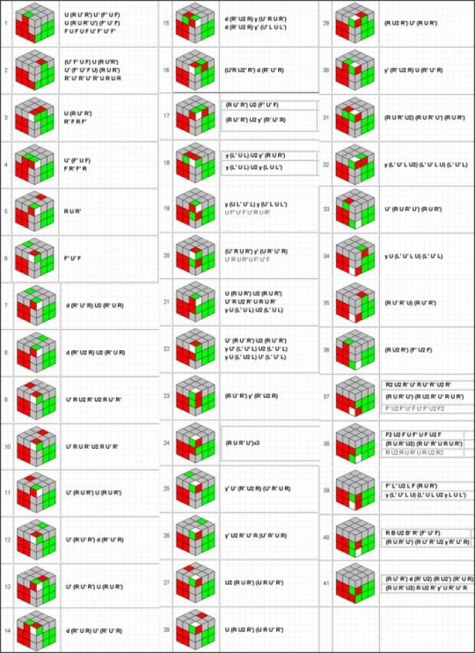 - Ensuite, deux couches du cube «F2L» sont assemblées simultanément. Ensuite, l'un de ces algorithmes est appliqué.
