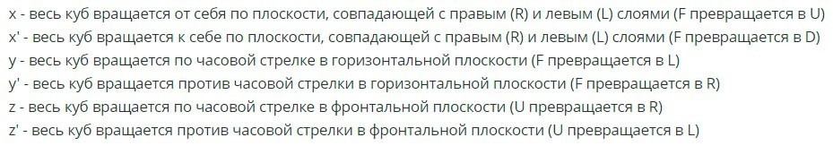 Lors du montage d'un puzzle, il est nécessaire non seulement de déplacer ses côtés, mais également de modifier la position spatiale du cube. Ces mouvements s'appellent l'interception. Schématiquement, cela peut être montré comme suit.
