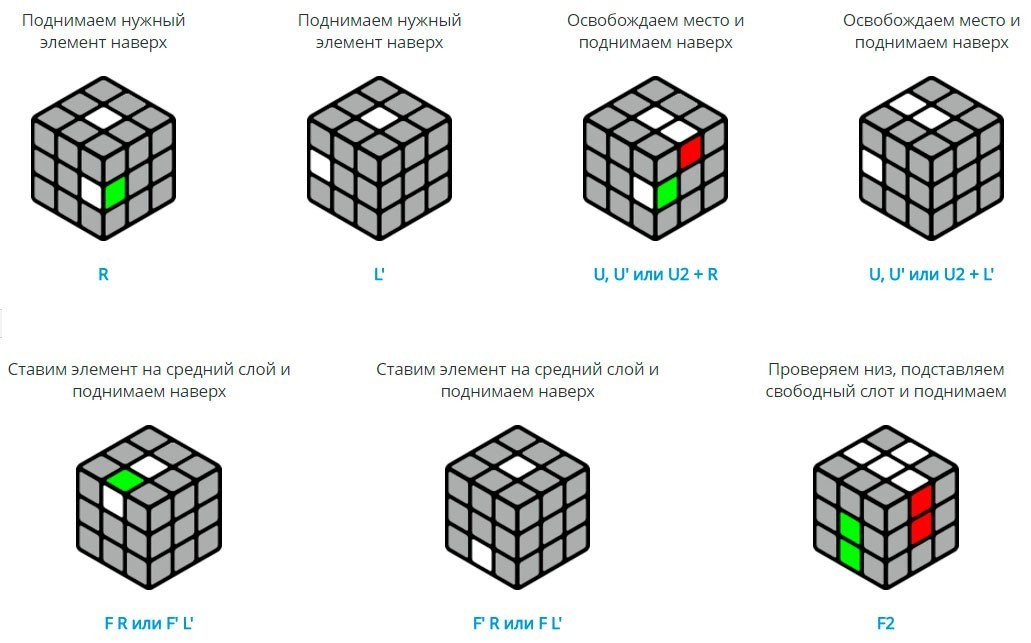 - À l'étape suivante, vous devez trouver le coin blanc du bas et placer un coin rouge au-dessus. Vous pouvez obtenir ce résultat de plusieurs manières, qui sont sélectionnées en fonction de l'emplacement initial des coins blanc et rouge.