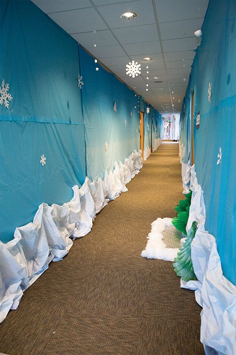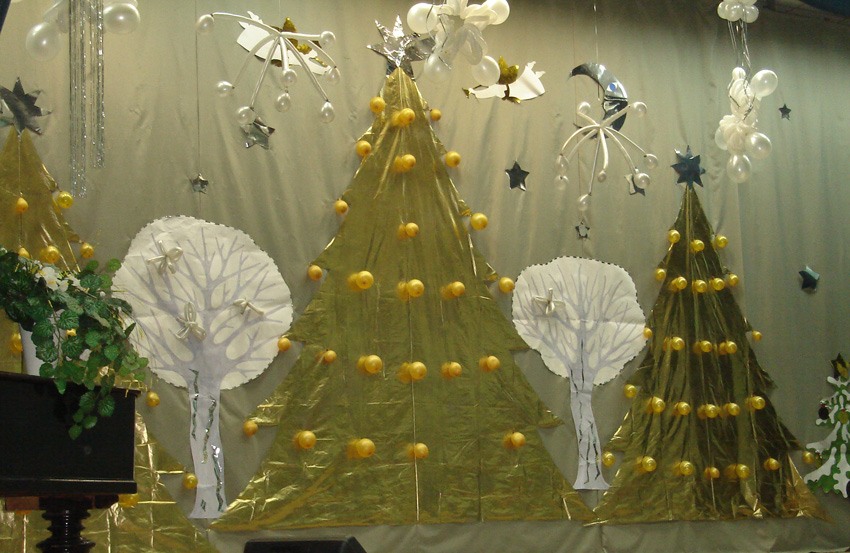 L'école a suffisamment de places dans les couloirs, où vous pouvez décorer le mur avec la pluie ou le clinquant habituel à la manière du Nouvel An. Et si vous abordez la question de la décoration des murs extraordinaire, alors seules, des solutions originales naîtront sous la forme de cônes multicolores en papier coloré ressemblant à des montagnes de fées. Il est tout à fait acceptable que le budget de l’école vous permette de transformer complètement le couloir de l’école en une grotte de neige d’un conte de fées du Nouvel An. Croyez-moi, la mise en œuvre d'une telle idée ravira les enfants.