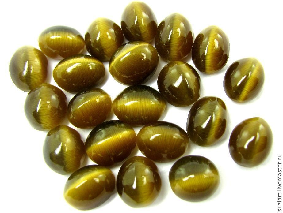 - Oeil de chat - une pierre de tons jaune ou miel. La bande verticale située à l'intérieur de la pierre la fait ressembler à un œil de chat. D'où le nom de la pierre.