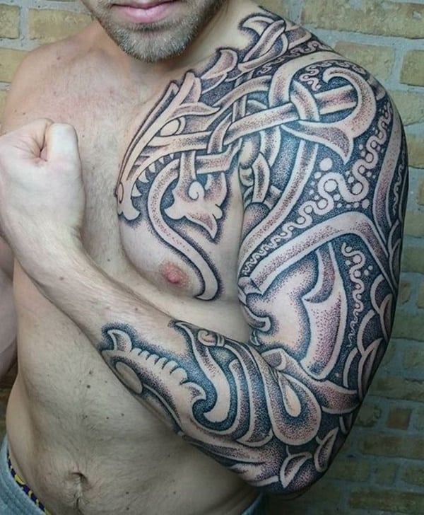 Les tatouages celtiques sur le corps d'un homme sont très attrayants, courageux et sexy. Les hommes peuvent appliquer en toute sécurité de grands tatouages celtiques sur leur corps. Les tatouages de motifs celtiques semblent attrayants pour le cou d'un homme. Ici, vous pouvez appliquer de grands ornements celtiques qui racontent les caractéristiques d’un personnage masculin. Et les motifs celtiques sur le dos de l’homme soulignent sa virilité et sa détermination. Des modèles similaires s’appliquent aux poignets, aux bras, aux avant-bras et aux épaules. Les professionnels font valoir que les ornements celtiques mettent l’accent sur la musculature masculine, il est donc avantageux d’utiliser de grandes images de nœuds. Ces tatouages attirent l'attention du sexe opposé.