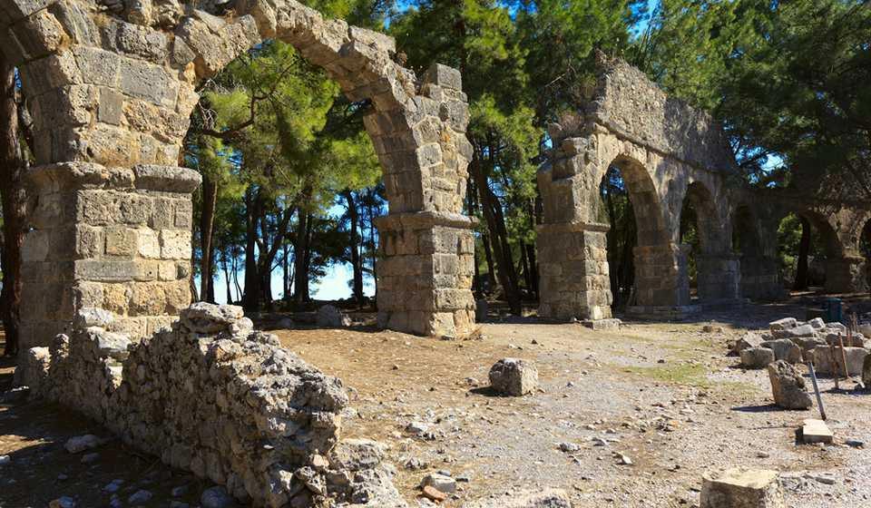 Les ruines de la ville d'Olympos, fondée au IIe siècle av. Ici, le temple d'Héphaïstos, le pont détruit, l'amphithéâtre sont préservés.