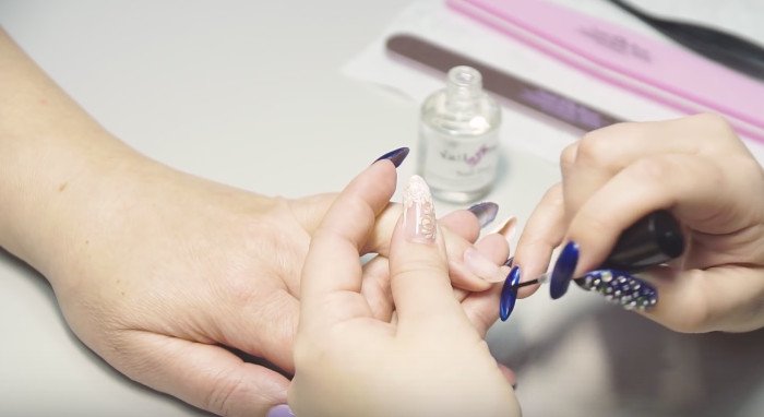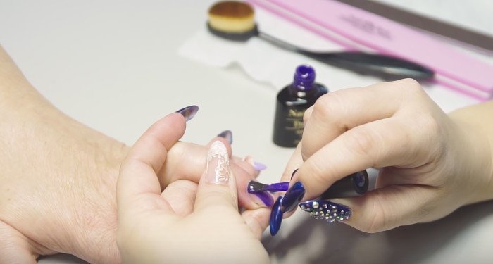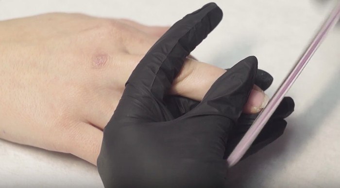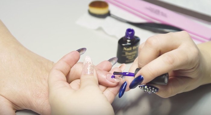 Pour que le gel lustrant reste longtemps sur les ongles, ceux-ci doivent être préparés. Pour ce faire, le maître traite la surface avec un buff spécial. Cela crée une rugosité sur la plaque à clous. La prochaine étape est le traitement avec une serviette avec un liquide pour le dégraissage des ongles naturels. Pour cette raison, les cosmétiques, ainsi que l'humidité et la poussière, sont éliminés de la surface.