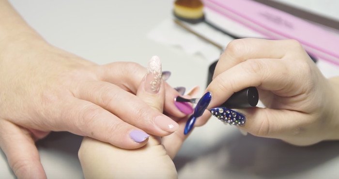 Ensuite, le maître applique la couche de base, qui doit être séchée dans une lampe.