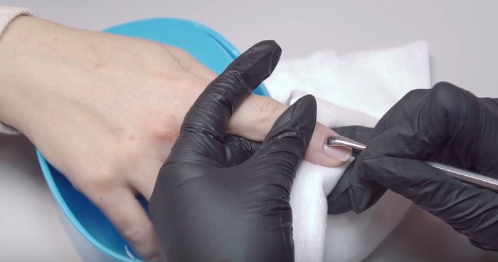 Ensuite, les mains doivent être placées dans un petit bain avec de l’eau tiède. Si nécessaire, du sel ou une solution de savon peut être ajouté. Cette procédure est nécessaire pour adoucir la peau autour des ongles.Souvent, le processus ne prend pas plus de dix minutes.
