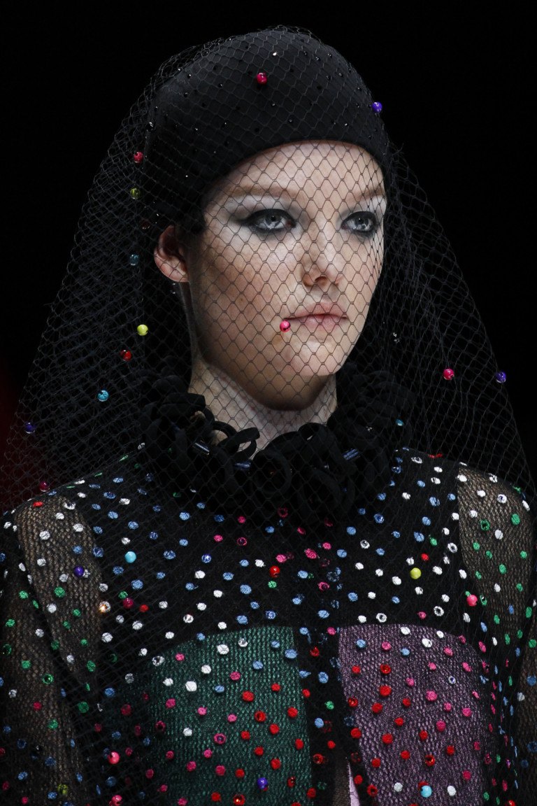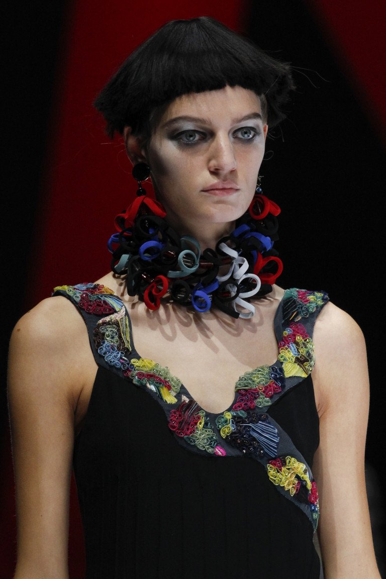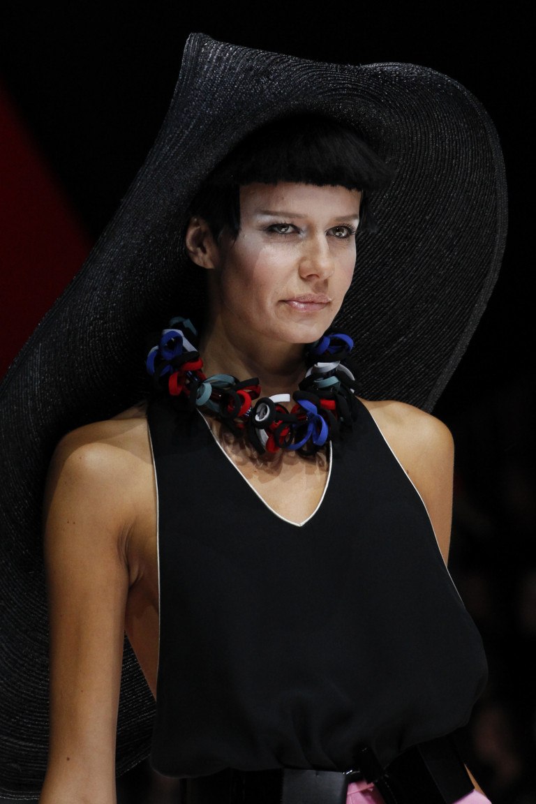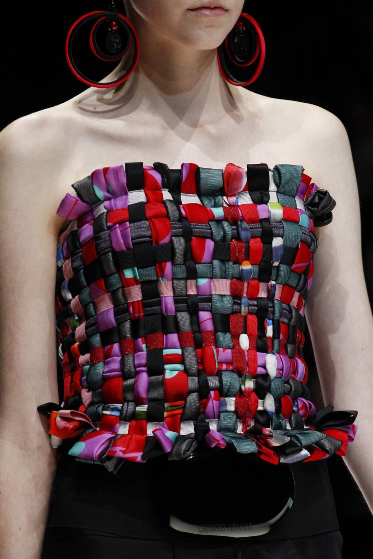 L'impressionnante collection estivale de Giorgio Armani se présente sous la forme d'images élégantes et rétro. La couleur noire de la collection est parfaitement complétée par toutes les couleurs de l'arc-en-ciel. Les corsets en osier, les décorations en forme de pois brillants, les chapeaux amusants et les bijoux originaux permettent aux femmes d’être ravissantes en été.