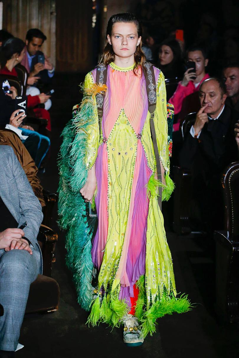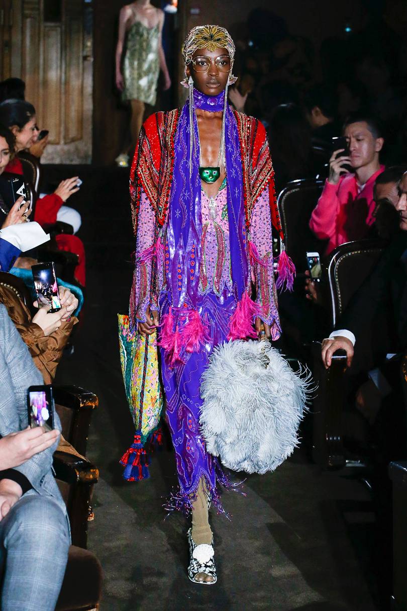 Alessandro Michele ne s'ennuie pas à la présentation de ses collections. Le salon du design a montré des notes d’extravagance et beaucoup de lurex, une frange de brillance. Et ce n'est qu'une petite partie de la présentation. Le plus surprenant était l'abondance de sacs, un décor en forme de plumes d'autruche, des ceintures sophistiquées à chaînes, des chaînes audacieuses qui couvrent la moitié du visage, des bijoux volumineux et des baskets volumineuses. Imaginez tout cela en tandem avec des couleurs vives et des imprimés colorés! Tout simplement adorable.