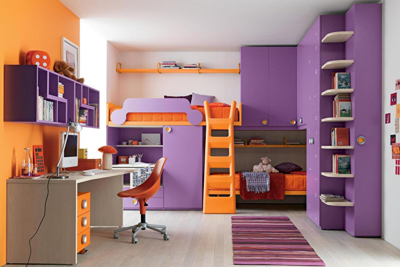 Il existe aujourd'hui sur le marché un grand nombre de meubles conçus pour plusieurs enfants à la fois. Une excellente option serait un lit superposé, où le lieu de travail est situé en dessous et où le lieu de couchage est au sommet. Ces complexes peuvent également comprendre des étagères et des tiroirs pour ranger des objets.