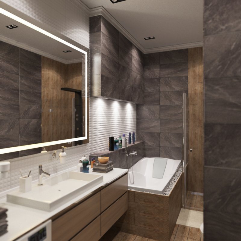 Les matériaux avec un ton brun naturel - tuiles en terre cuite, pierre naturelle, brique donneront une touche écologique à l’intérieur. La combinaison de plomberie blanche et de garniture brun foncé est très élégante.