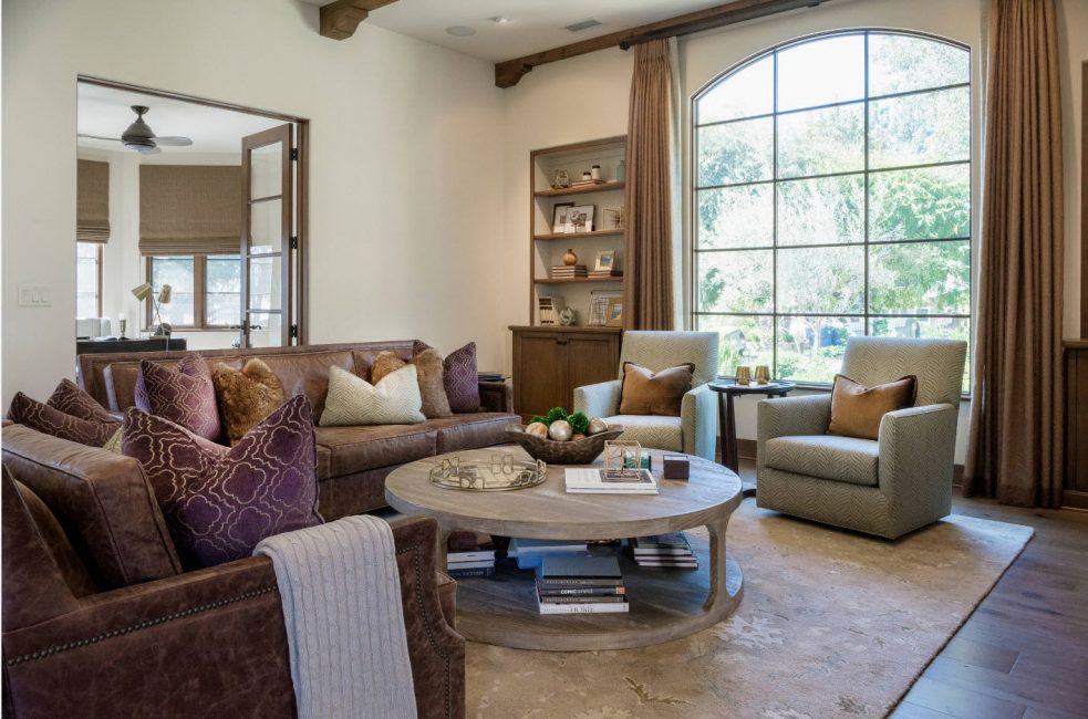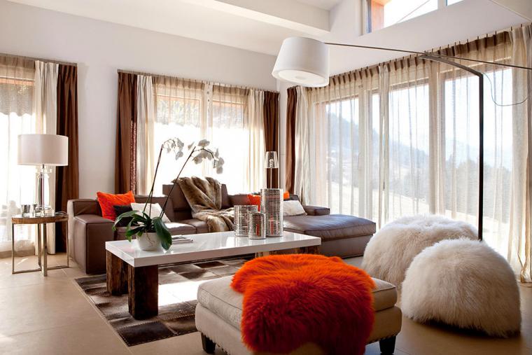 Cette couleur naturelle sur diverses textures est naturelle. Les textures suivantes apporteront individualité et fraîcheur à la pièce - tissage de tapis, rugosité de la pierre, brillant du cuir, pilosité de velours, soie douce, structure en bois. Dans la conception de la pièce, une combinaison de marron et d’autres couleurs est utilisée dans presque tous les styles, du pays au classique.