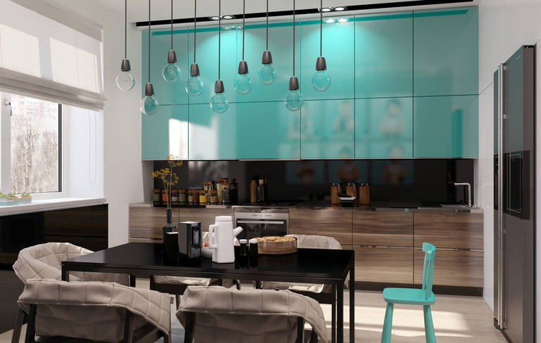 Dans le thème marin, le marron et le bleu / turquoise sont devenus des classiques. Même lorsqu'il n'y a pas de notes marines dans le thème de conception, elles ajoutent encore de la romance. Dans les styles modernes, cette combinaison est très souvent utilisée. Dans ce cas, le brun est utilisé dans la conception des portes et des fenêtres, dans le revêtement des murs et des sols, dans les meubles et en bleu / turquoise - dans les décorations, les accessoires ou les appareils ménagers.