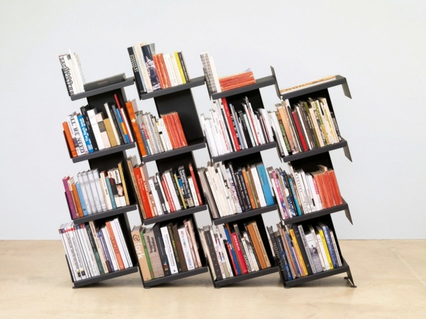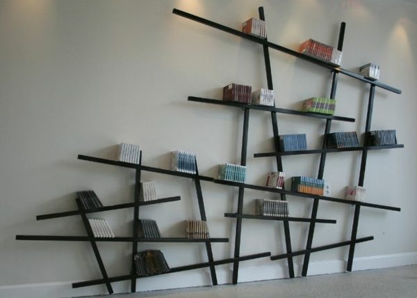 La forme de l'étagère peut être différente. À l'intérieur, vous pouvez souvent trouver des modèles invisibles. Cet effet peut être obtenu grâce au fait que tout l'espace est rempli de livres. Il semble intéressant options de zigzag, modèles sous la forme d'escaliers et une variante avec une pile d'étagères.