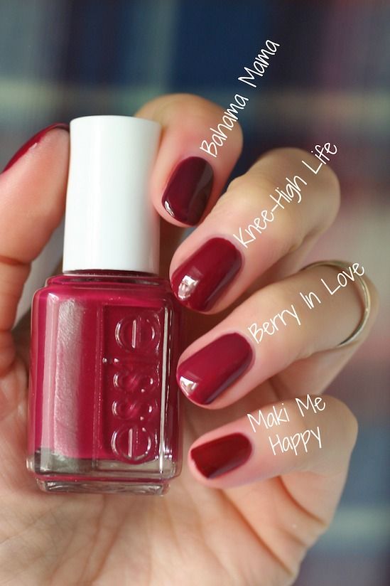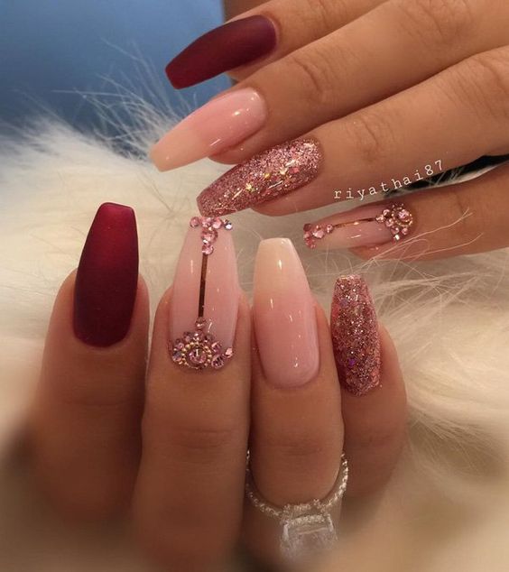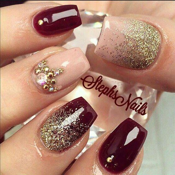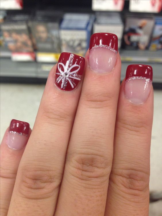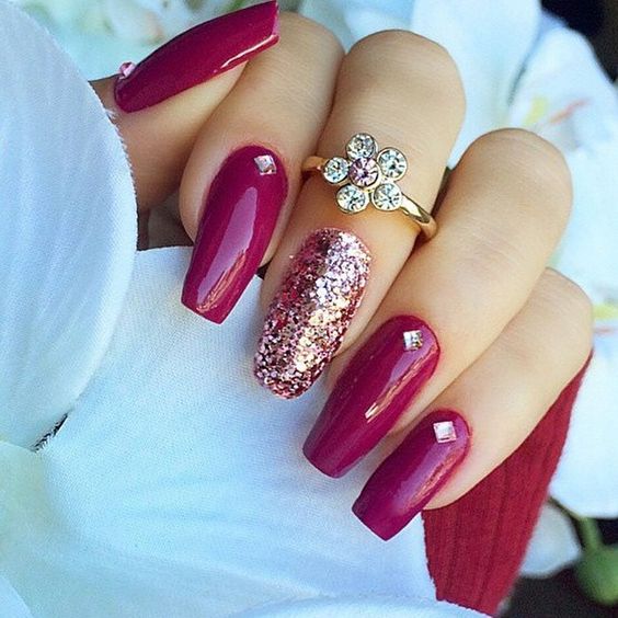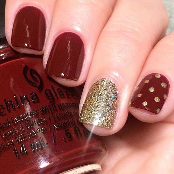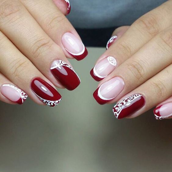 Pour la manucure, vous pouvez utiliser n'importe quel ton de rouge. Mais le meilleur de tous, l'ombre de vin va regarder sur les ongles courts. Pour donner à la manucure un aspect festif, elle peut également être décorée de strass ou décorée d’un motif.