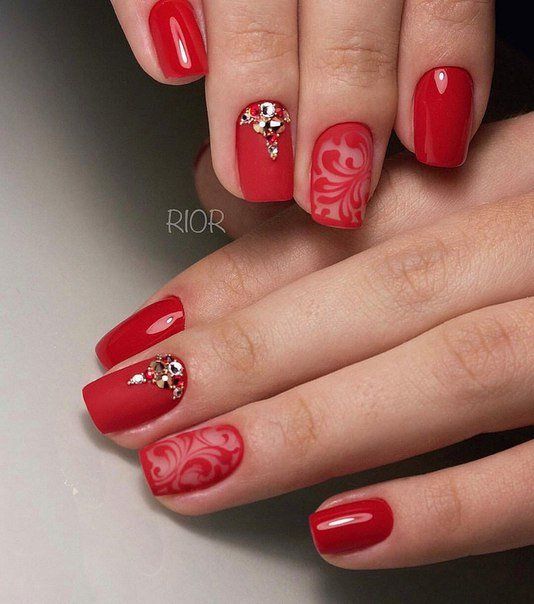 La manucure rouge en elle-même est brillante et attrayante, elle convient à toutes les occasions. Au quotidien, un revêtement monochrome de clous avec des nuances de rouge foncé. Si vous avez besoin d'une manucure du soir, vous pouvez laisser libre cours à votre imagination et utiliser tous les types de décor.