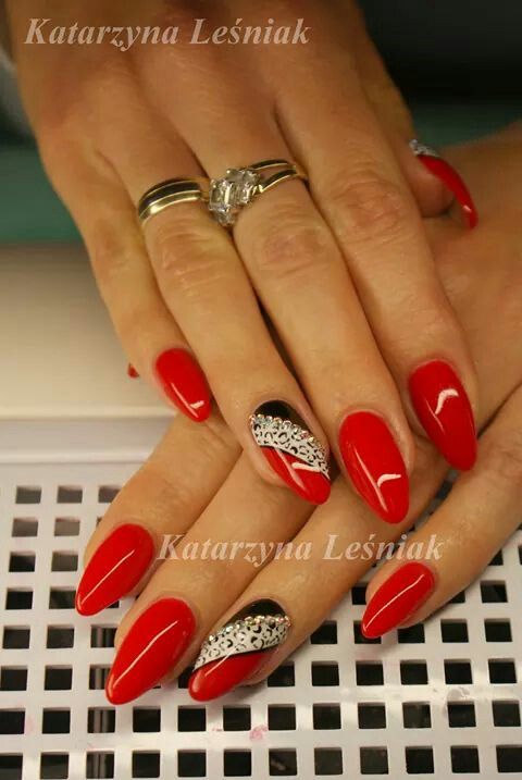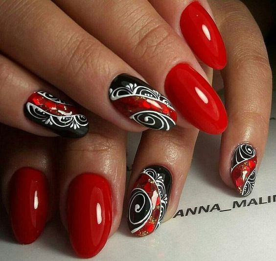 Cette combinaison convient aux filles capricieuses et confiantes. Dans ce cas, une manucure dans les tons noir et rouge conviendra non seulement lors de la célébration, mais également lors d'une réunion de travail. Si vous ajoutez une couleur blanche à la manucure rouge-noir, cela donnera une touche de romantisme.