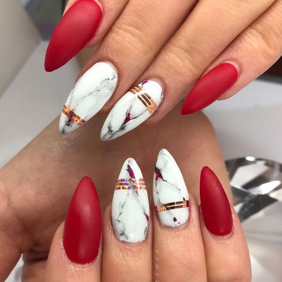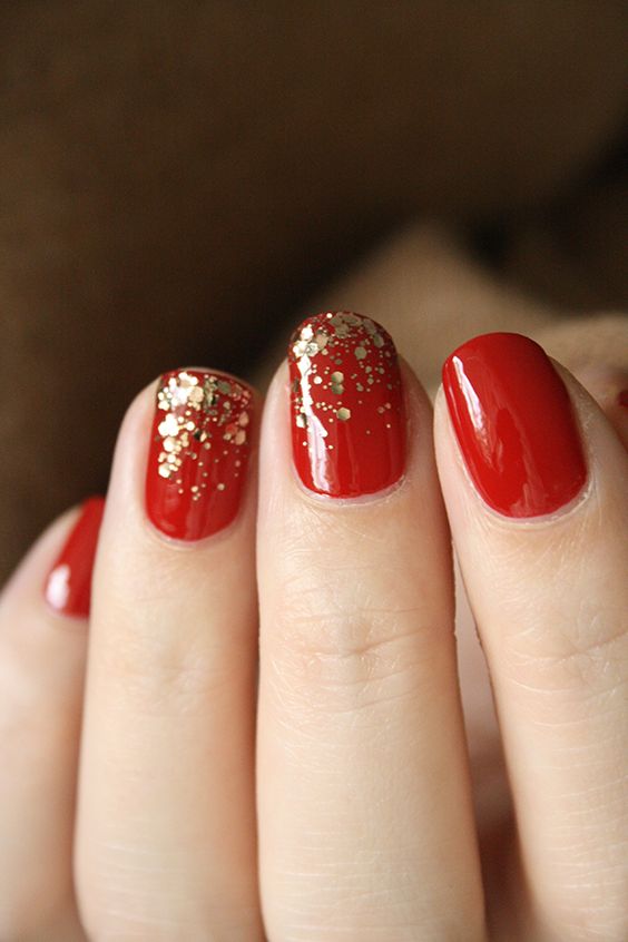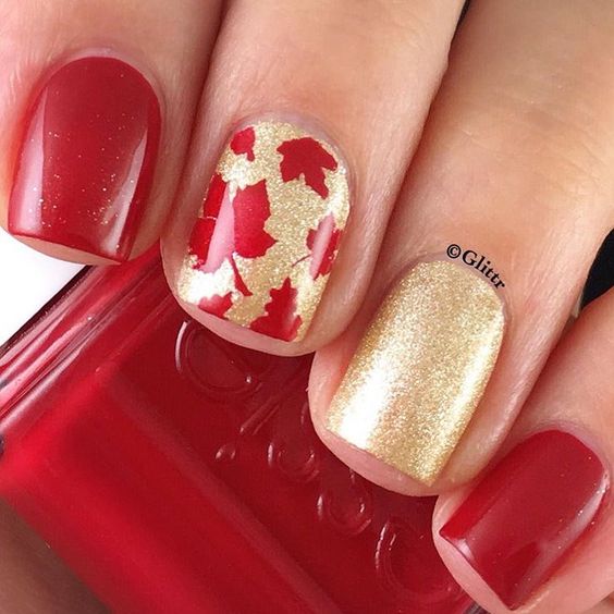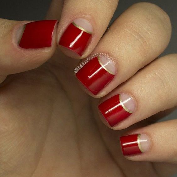 Cette combinaison est choisie par les filles confiantes. Pour créer une combinaison rouge-or, vous pouvez utiliser du vernis brillant, du papier d'aluminium et d'autres décorations. Très souvent, une feuille d'or est appliquée sur un ongle peint en rouge sous forme de rayures. En outre, en utilisant un vernis doré, vous pouvez réaliser des dessins abstraits sur une base rouge.