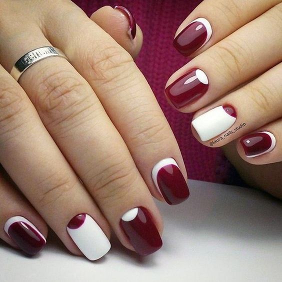 Pour le bureau, le vernis rouge peut être combiné avec du blanc, du noir ou de l'or. Cette combinaison convient aux manucures françaises, lunaires ou à l’application de motifs géométriques et autres.