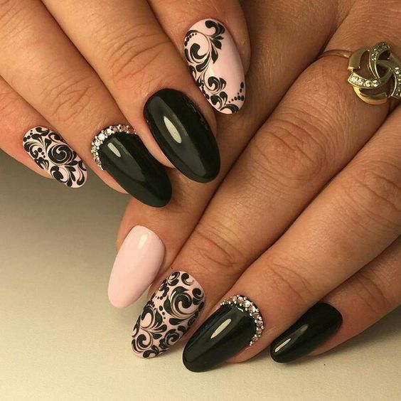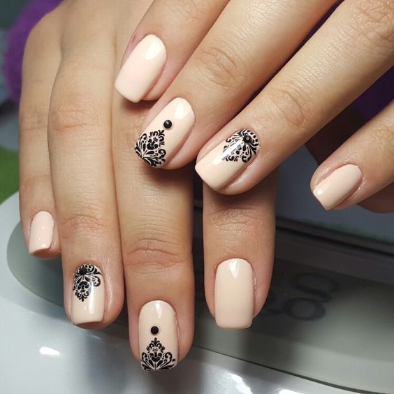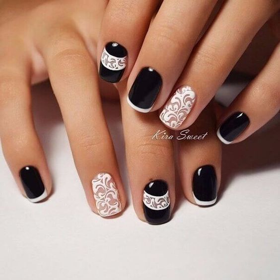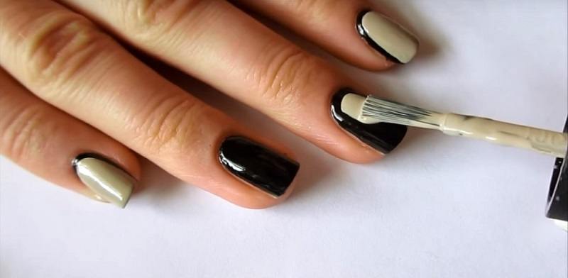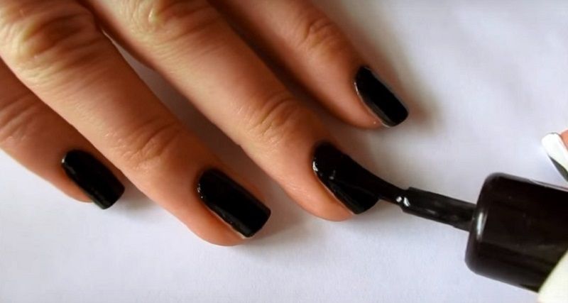 Avant de procéder à la conception, assurez-vous de traiter la cuticule et de donner aux ongles la même forme. Seulement dans ce cas, le résultat sera vraiment attractif. Après cela, appliquez du vernis noir et attendez qu'il sèche.