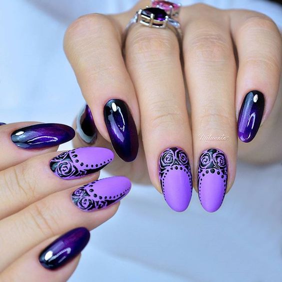 Le motif de dentelle lui-même est très doux. Mais en fonction de la nuance, vous pouvez définir un caractère différent pour le motif. En outre, cela dépend beaucoup de la présence d’un tel motif sur chaque ongle ou seulement d’un accent. Assez souvent, la dentelle est complétée par un enduit monophonique ou un style spécifique.