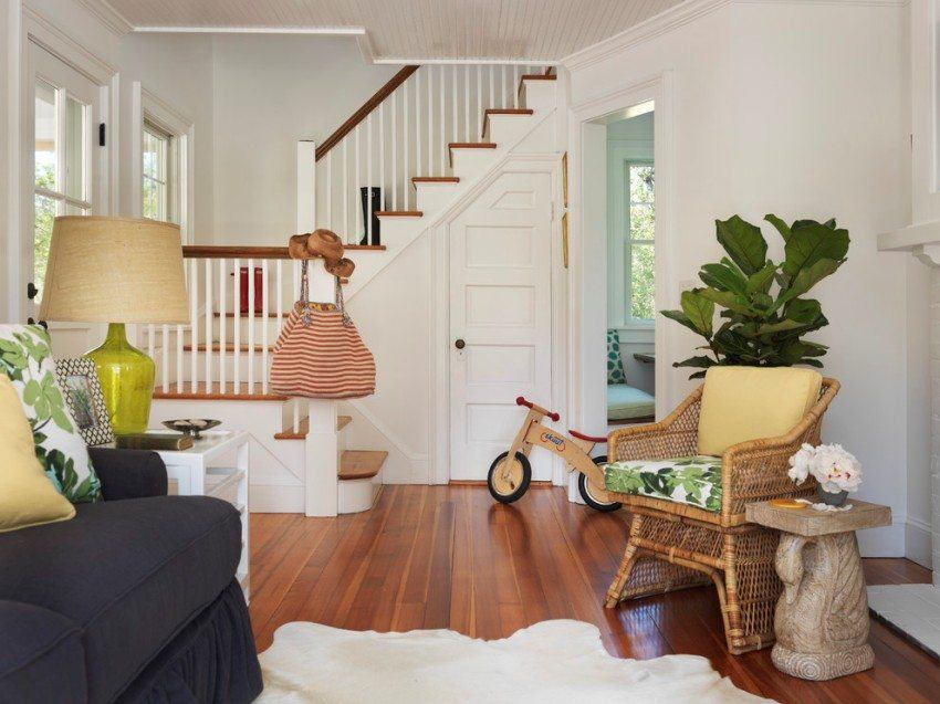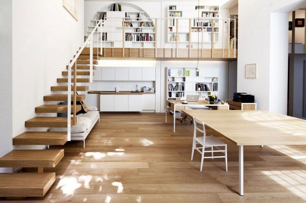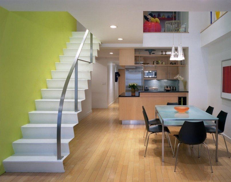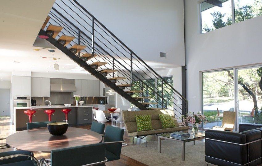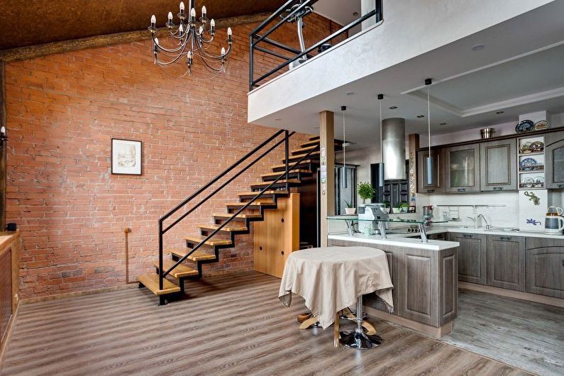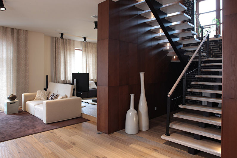 Le salon est à la deuxième place en termes de popularité de l'installation de cette structure nécessaire pour le levage au deuxième étage. Pour les bâtiments de taille moyenne, l'emplacement idéal. Pour le zonage, un escalier peut être utilisé si la cuisine est combinée avec le salon.