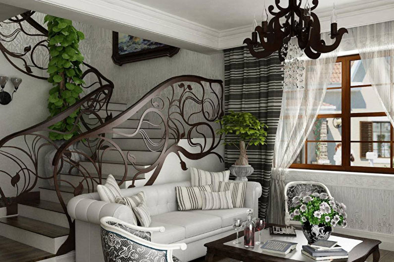 Lors du choix de la conception des escaliers menant au deuxième étage, il est nécessaire de prendre en compte le style de la pièce entière.