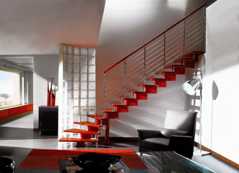 Un escalier de ce style ne devrait pas attirer l'attention. Il forme un tout avec la pièce. Marches sur les furoncles est une excellente solution.