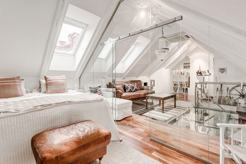 Cet endroit est le plus isolé dans un tel appartement. Du reste de l'espace, il est bloqué par des murs ou une cloison opaque. Si la hauteur du plafond le permet, la chambre à coucher peut être déplacée au deuxième niveau.